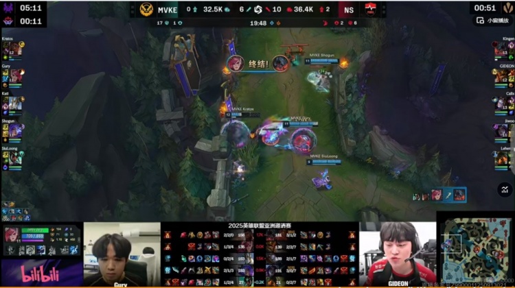 [22:01]野区遭遇,Lehends泰坦等到Kingen剑魔TP落地直接一钩配合队友秒了Gury蔚,随后团战Shogun芸阿娜被NS下野黏住还吃了个泰坦大也没了,正面Kingen剑魔一打三毫无压力!NS轻松一波0换5团灭MVKE!拉开9K经济差了!