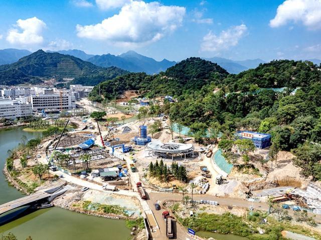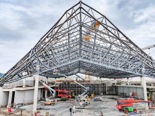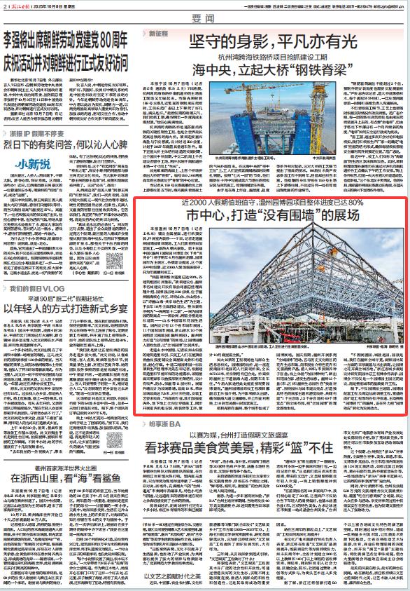 如火如荼的工程现场也与群众生活息息相关。园博园跨线桥,是一座连接南园和北园的人行景观桥梁,全长467.62米,桥身钢结构已合龙。桥梁横跨温州主干道瓯海大道,假期车来车往。“今后大家途经此处能直接观赏园博景观。”温州园博园跨线工程项目部副总工林强介绍,为不影响群众出游,确保瓯海大道交通顺畅,桥上作业利用晚上10时至凌晨6时加紧施工。