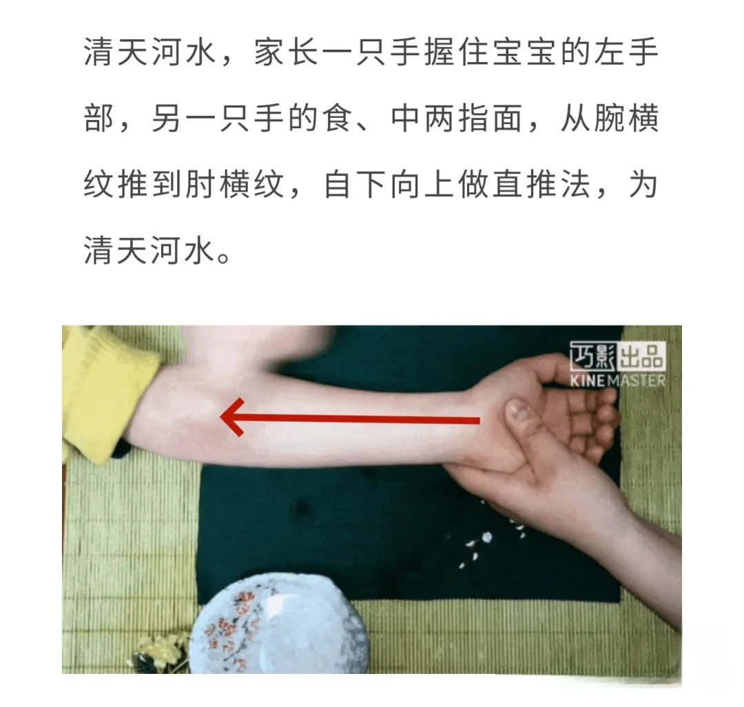 操作:家长一只手握住宝宝的左手部,另一只手的食、中两指面,从腕横纹推到肘横纹,自下向上做直推法,为清天河水。