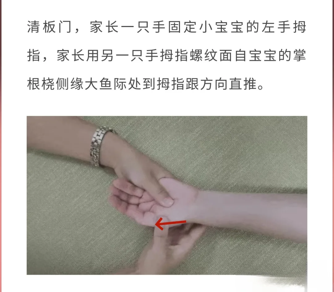 操作:家长一只手固定小宝宝的左手拇指,家长用另一只手拇指螺纹面自宝宝的掌根桡侧缘大鱼际处到拇指跟方向直推。