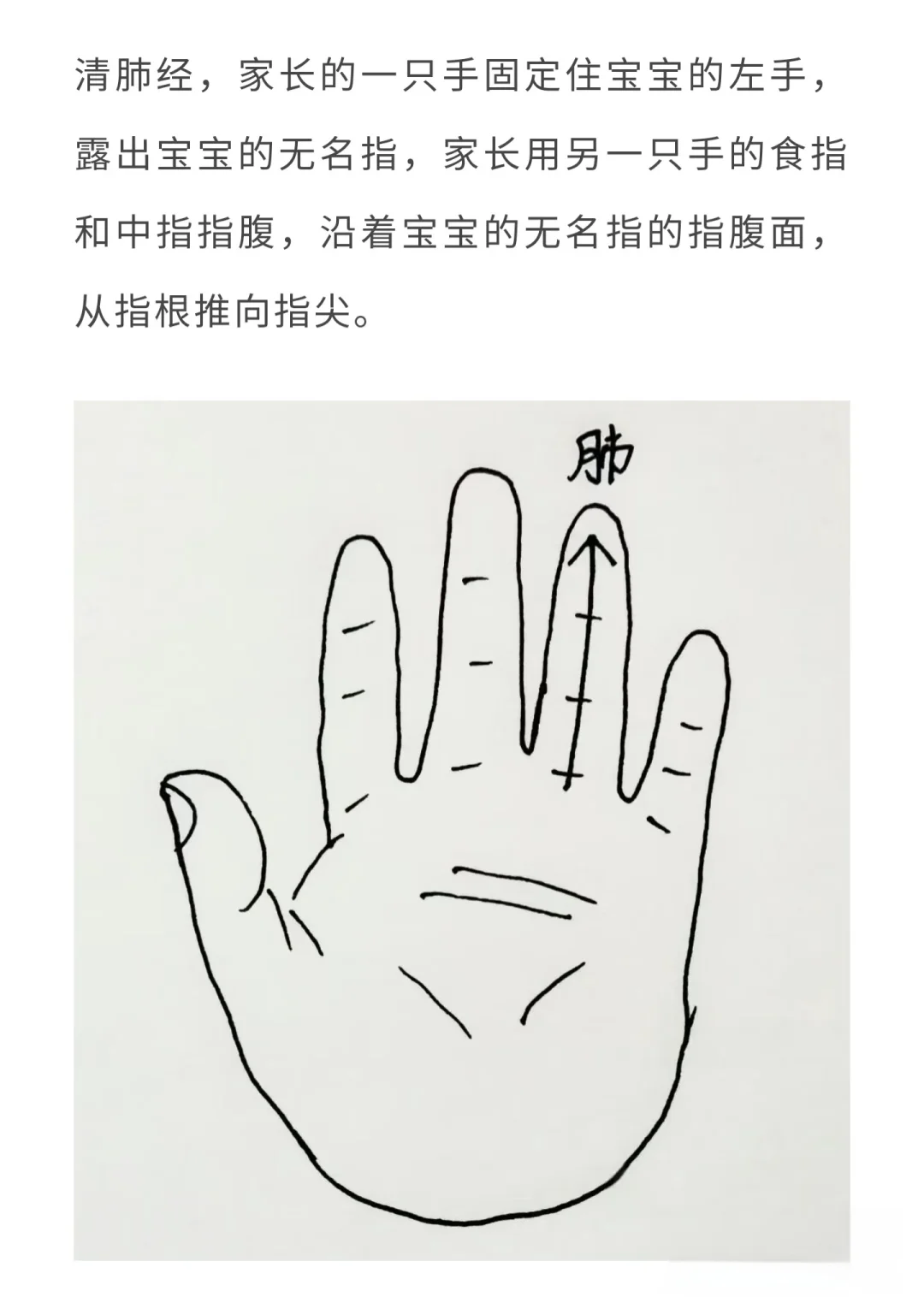 操作:家长的一只手固定住宝宝的左手,露出宝宝的无名指,家长用另一只手的食指和中指指腹,沿着宝宝的无名指的指腹面,从指根推向指尖。