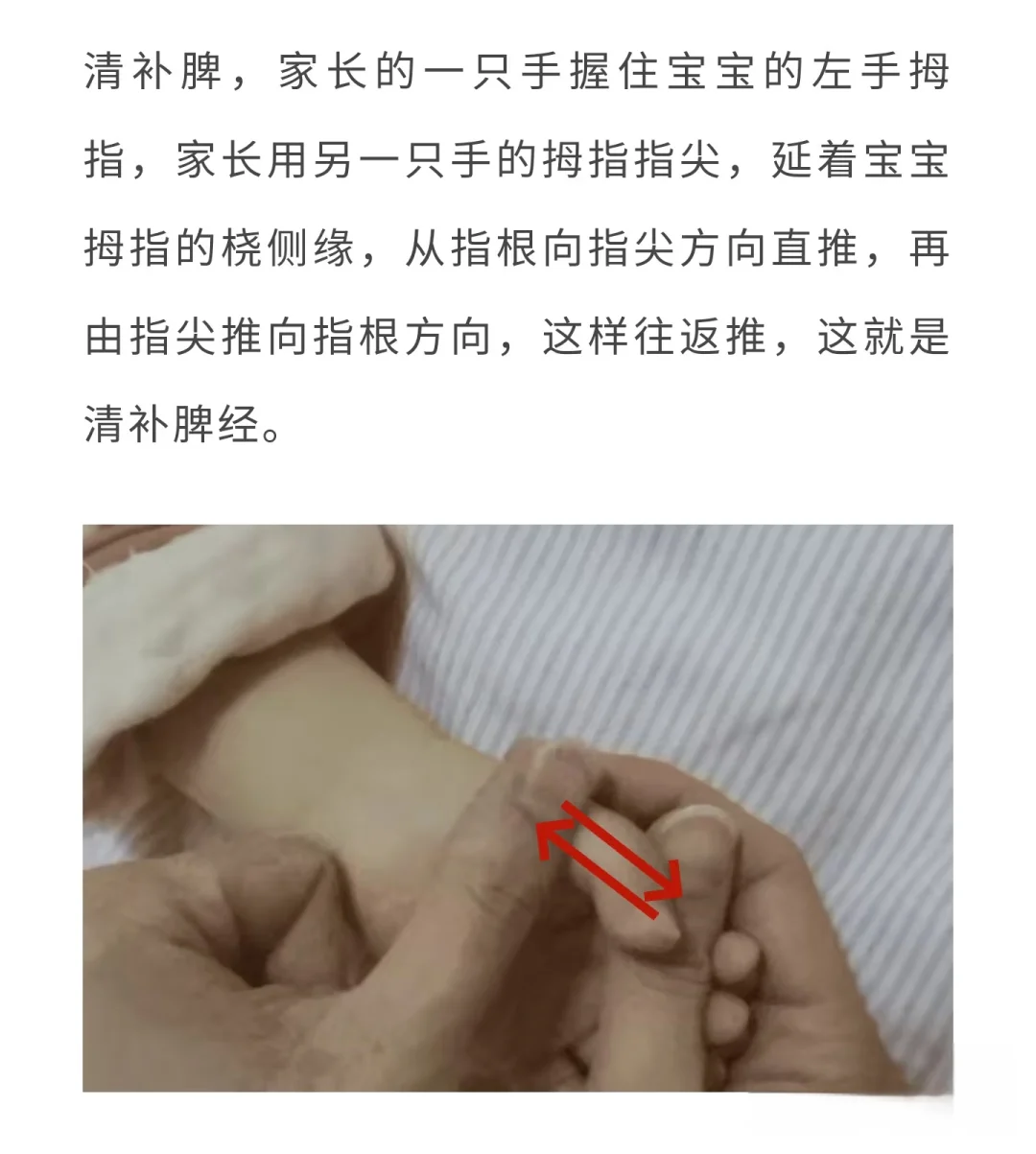 操作:家长的一只手握住宝宝的左手拇指,家长用另一只手的拇指指尖,延着宝宝拇指的桡侧缘,从指根向指尖方向直推,再由指尖推向指根方向,这样往返推,为清补脾经。