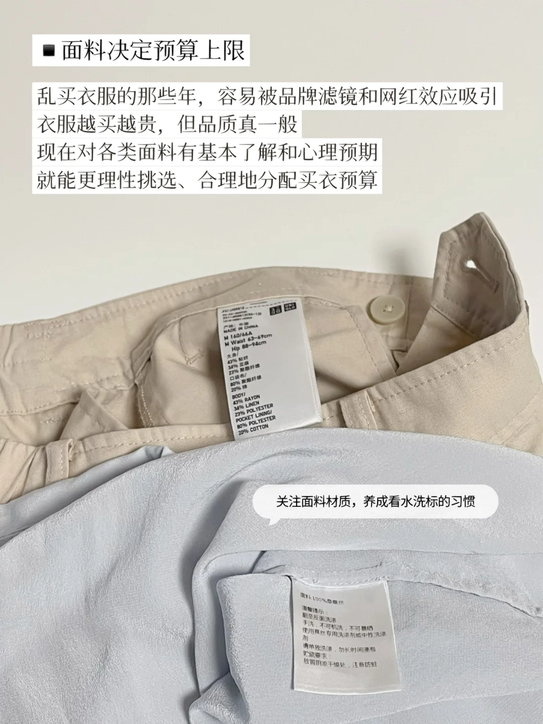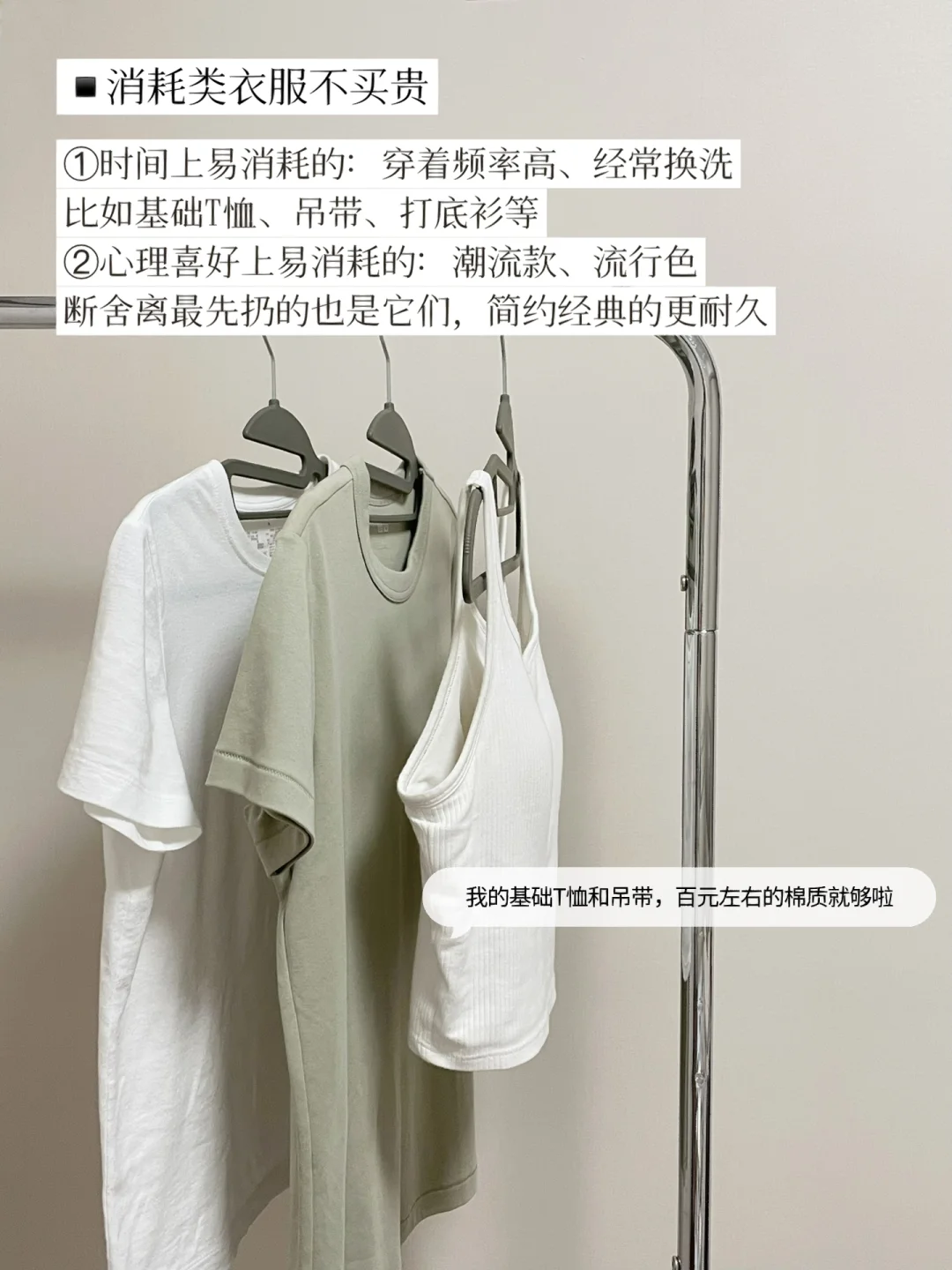 为什么要精简衣橱?一是希望自己不乱买衣服,二是想通过这种方式找到自己的穿衣风格。 一年过去,也算有了一些小小进步。聊聊我改变最大的几点衣橱消费观。 . ▪️面料决定预算上限 老一辈人好像大多会看面料,伸手摸一摸就知道值不值。而自己乱买衣服那些年,很容易被品牌滤镜或网红效应吸引,衣服越买越贵,但品质真一般。 现在对各类面料有基本了解和心理预期,就能更合理地分配买衣预算。以夏装常见面料为例: 棉:透气吸汗,亲肤柔软;缩水易皱 麻:吸湿透气不沾身;弹性差,易皱 桑蚕丝:舒适、光滑柔软有光泽;较贵 粘纤:吸湿性好,不易静电;弹性、耐磨性差 聚酯纤维:抗皱、不易变形;吸湿透气性差,静电 醋酯纤维:手感爽滑、舒适;易缩水 . ▪️消耗类衣服不买贵 ①时间上易消耗的:年抛衣,比如基础T恤、吊带、打底衫等,这类穿着频率高、经常换洗的,选择棉质或混纺即可,不用太贵 ②心理喜好上易消耗的:潮流款、流行色。人都是喜新厌旧的,断舍离最先扔的也是它们,简约经典的才经得住时间考验 . ▪️下装适当提高预算 相比上衣的丰富,下装更需要精简。以前觉得随便买买就可以了,现在发现版型优秀、利用率高的下装是值得投入的。比如一条很合身的牛仔裤、一件写着自己名字的半身裙 下装买少买好,可以实现数量做减法,搭配做乘法 . ▪️用投资思维买衣服 不要总被“打折”“便宜”吸引,如果总是草率的买、将就的穿,不仅常常觉得没衣服穿,生活幸福感也会大大降低 学会用投资思维买衣服,只买真正喜欢、合适的,计算每次着装成本CPW=价格/穿着次数。CPW越低,才是性价比和快乐的双赢 . ▪️回购可以高效省心 买衣服其实是一件挺消耗时间精力的事,搜索、看测评、挑选款式、对照尺寸详情、看买家评价、加购、试穿、决定去留... 踩过很多坑,发现找到自己的风格不算一件容易的事,但找到适合自己的风格很重要,可以让购买更加高效省心。盘点回购较多的品牌...共同点可能就是简单舒适 以上。谢谢你看到这里 ᵕ̈ 下次见~🤍 简单生活