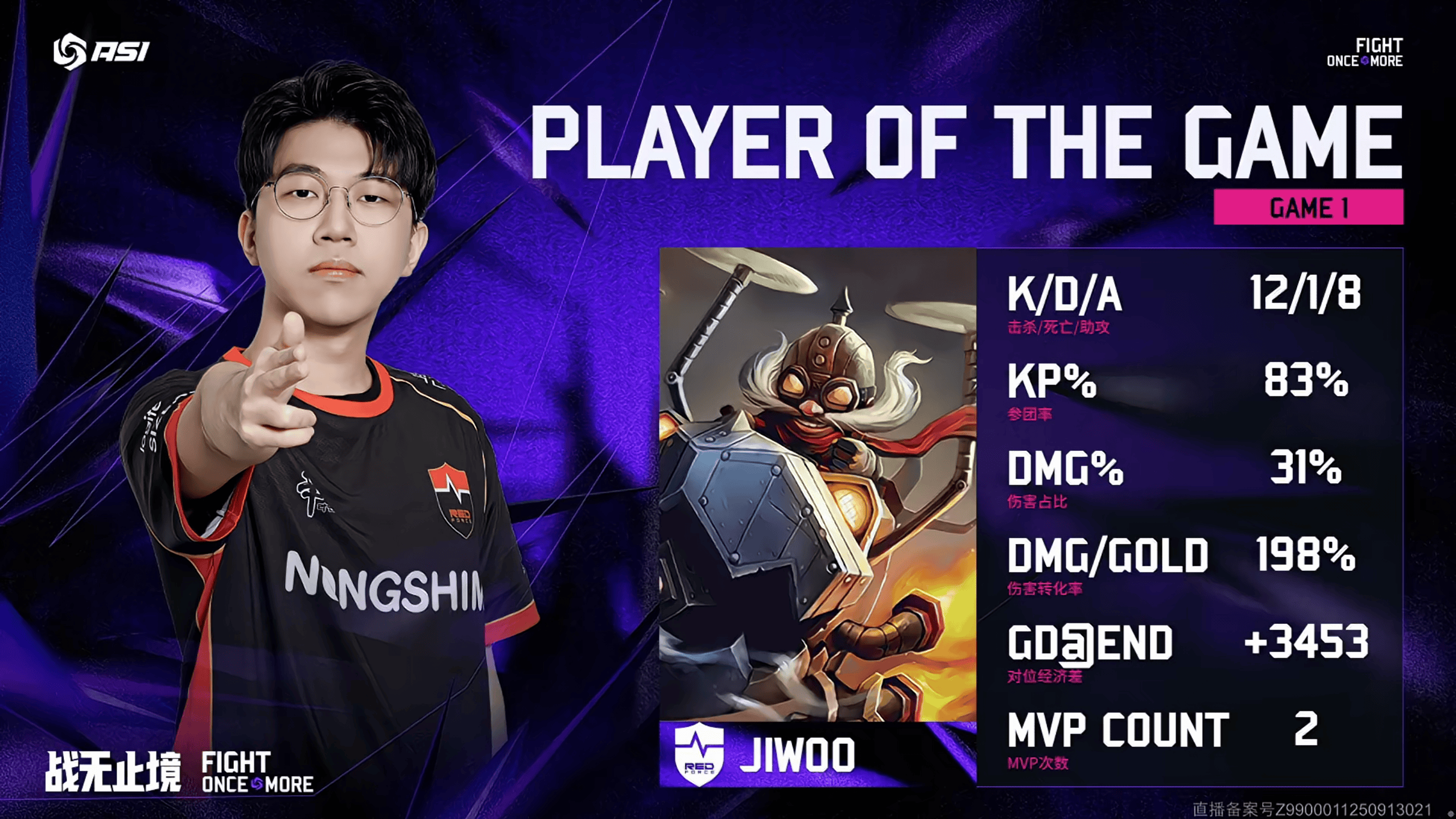 Jiwoo飞机打出12/1/8战绩,拿下NS对阵NIP第一局MVP