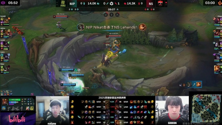 [20:23]下路三角草开战,niayou皇子火锅扣两人,Leave厄斐琉斯烟花放出,B神阿卡丽进场被GIDEON猴子敲掉,Leave与Niket瞬间被杀,NS打出0换5团灭NIP,经济领先5k。