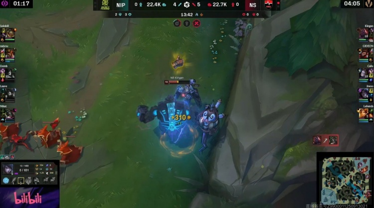 [18:05]小龙团,GIDEON猴子拿到小龙,NS听牌土龙魂。Calix发条拉NIP两人,Leave厄斐琉斯先杀Kingen赛恩,Jiwoo卡莎飞脸再杀naiyou皇子,双方打出1换1,NS经济领先2k。