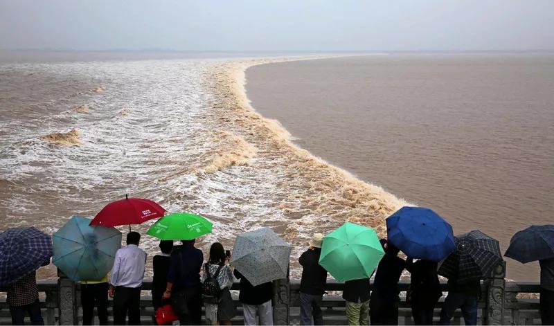 钱塘江再现“龙鳞潮”。10月6日起至农历八月十八,是钱塘江大潮最佳观赏期。10月6日在海宁盐官观潮胜地公园,多股潮头齐头并进后形成“一线潮”逆流而上,到了老盐仓还形成回头潮。10月1日,盐官段还出现了“龙鳞潮”奇观,吸引十万游客。这“龙鳞潮”学名“矩阵潮”,是2024年被认证的新潮型。当时潮头高2.1米,浪花排列密度每平方米超300个,形成8公里“龙鳞阵”。东潮与南潮45度角交汇,“鳞片”直径约30厘米,每秒推进5米,像科幻能量矩阵。