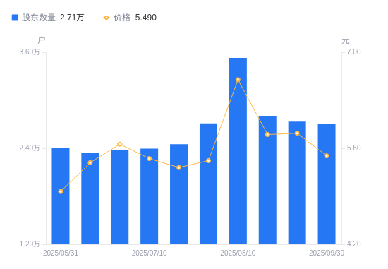 日期A股户数(户)流通A股户均持股数(股)户均持股市值(万元)2025-09-302706617246.419.472025-09-202732517082.949.942025-08-312796116694.379.682025-08-103528413229.558.732025-07-312711417215.889.332025-07-202451619040.2710.132025-07-102395819483.7410.622025-06-302381819598.2611.092025-06-202345319892.4510.722025-05-312408519370.469.63