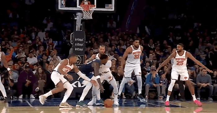 第一节比赛中,布伦森倒地后送出背后妙传,布里奇斯助飞亚布塞莱空接暴扣。