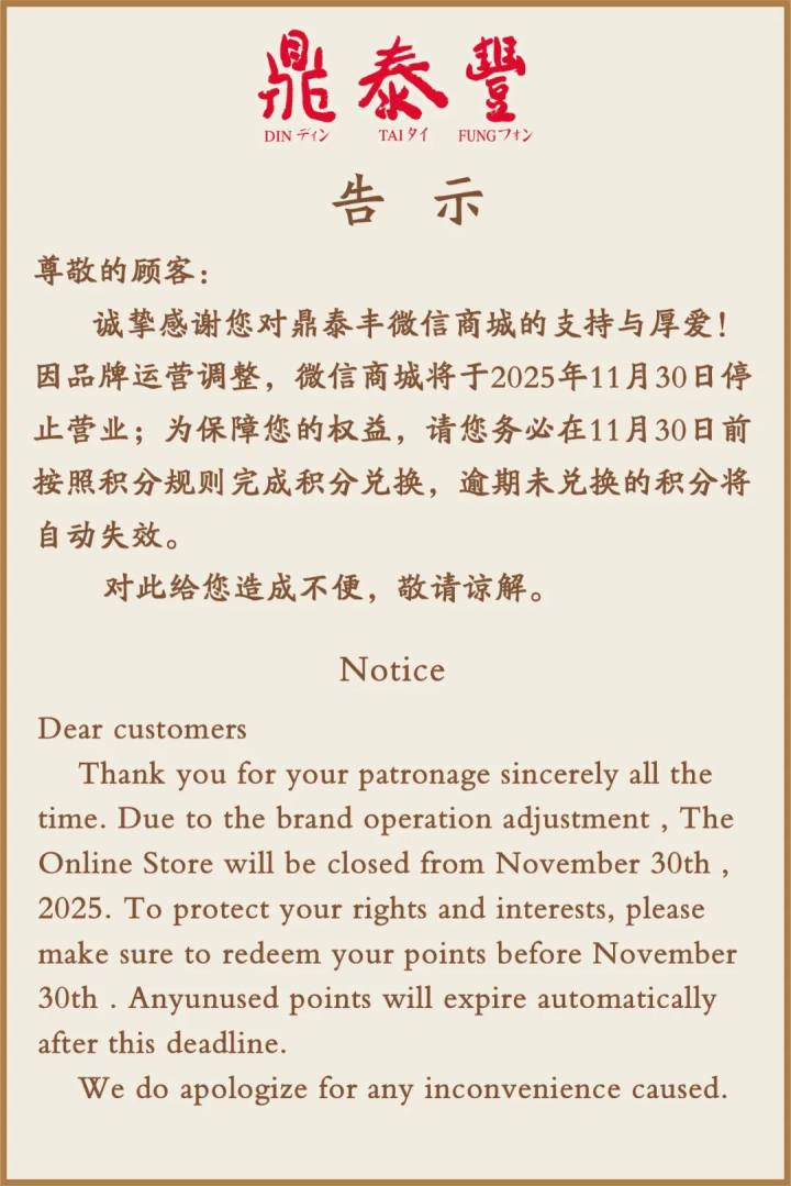 官方微信商城将于2025年11月30日停止营业;为保障顾客的权益,顾客务必在11月30日前按照积分规则完成积分兑换,逾期未兑换的积分将自动失效。