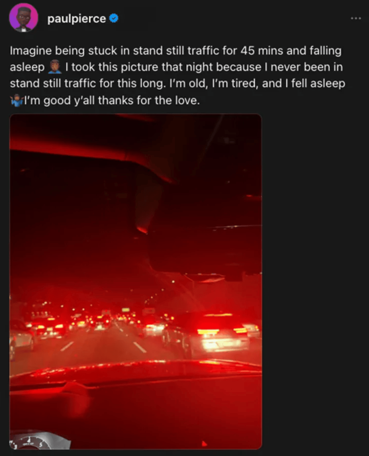 皮尔斯写道:“想象一下被堵在停滞不动的车流中45分钟,然后我睡着了♂。那天晚上我拍了这张照片,因为我从未经历这么长时间的堵车。我老了,累了,然后就睡着了♂。我还好,感谢你们的关心。”