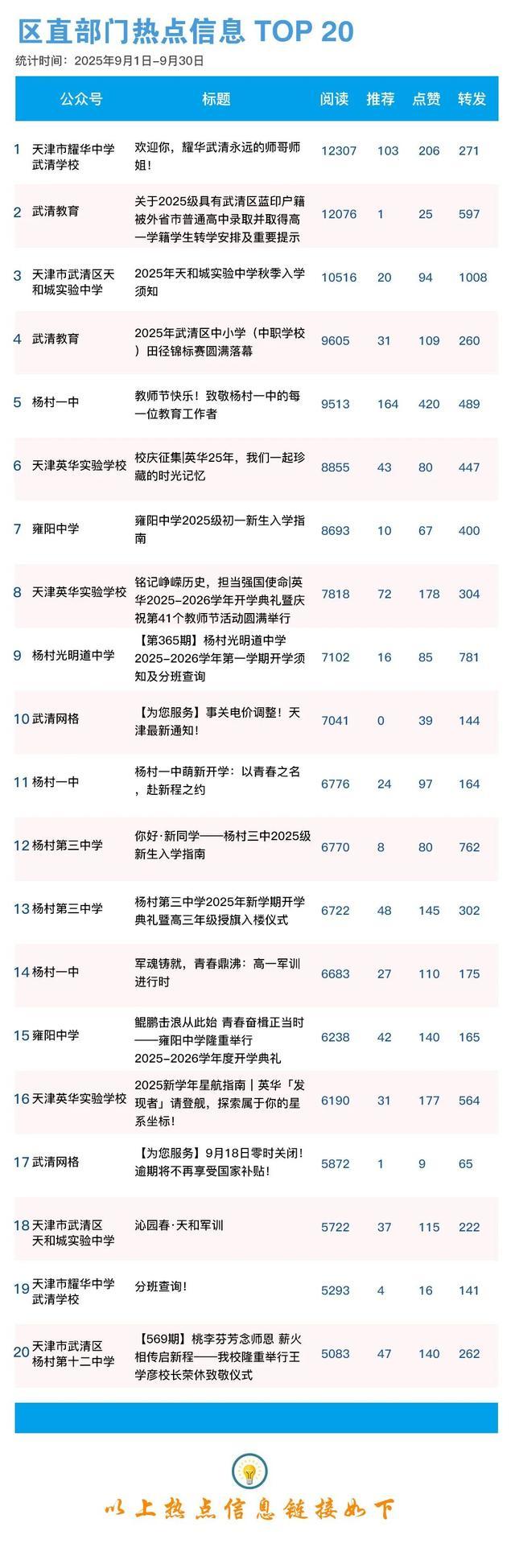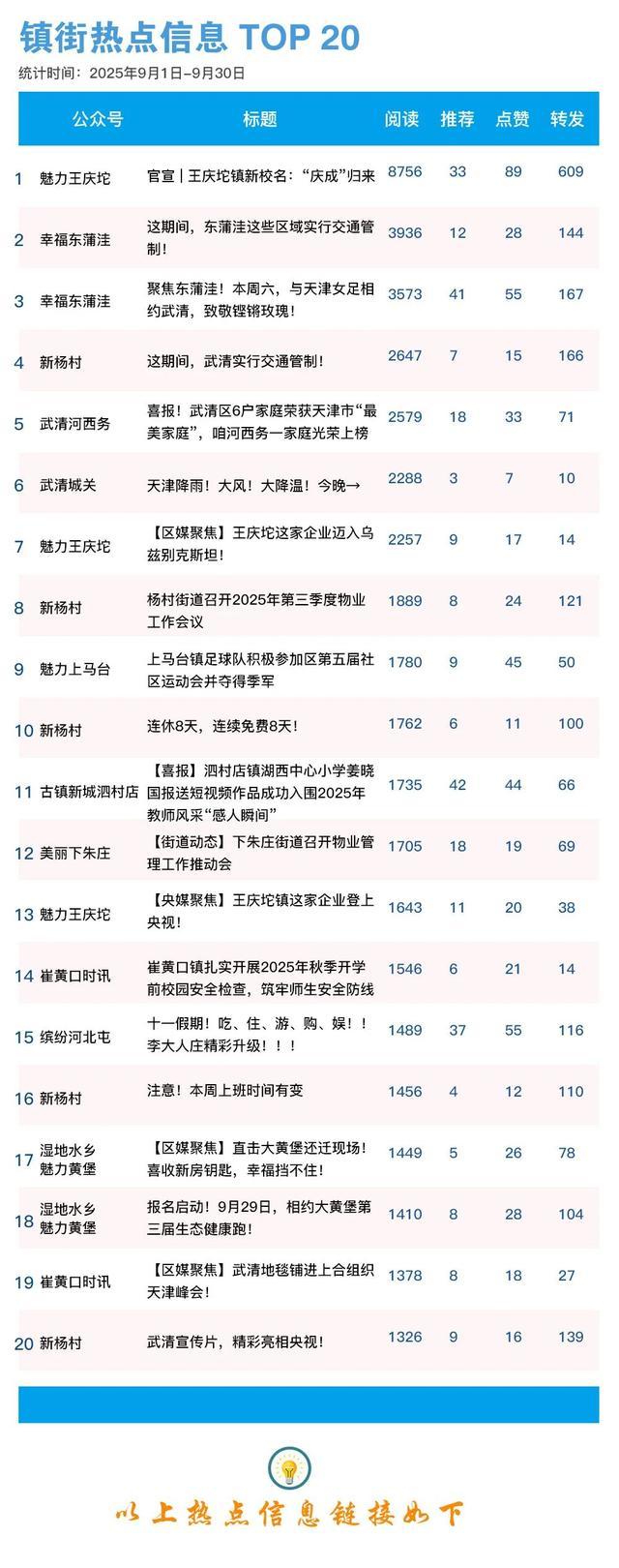 2025年9月份,武清区各级政务新媒体充分发挥主力军作用,聚焦“双节”长假活动预热、开学第一课、文旅活动、消费市场等热点,推出一批接地气、有网气、聚人气的精品力作,为加快建设京津明珠、幸福武清营造浓厚网络舆论氛围。9月份各镇街、区直各部门热点信息有哪些?一起来看↓↓↓