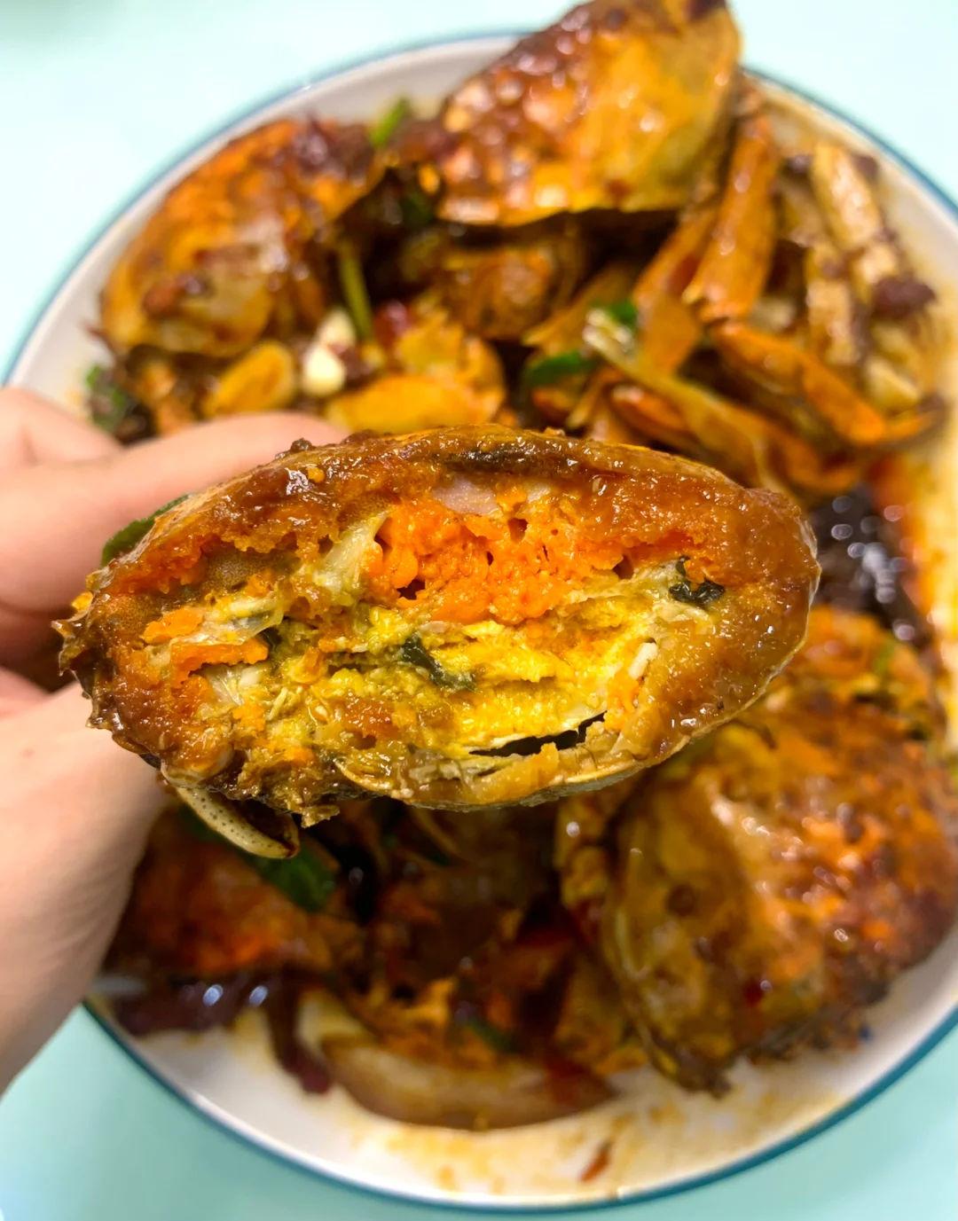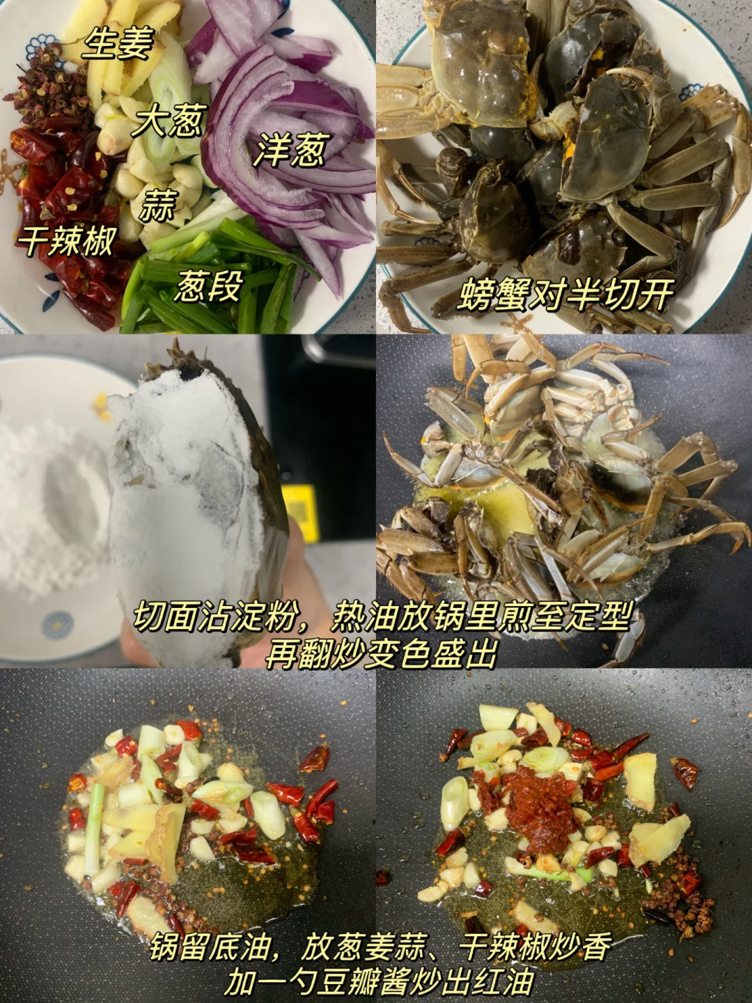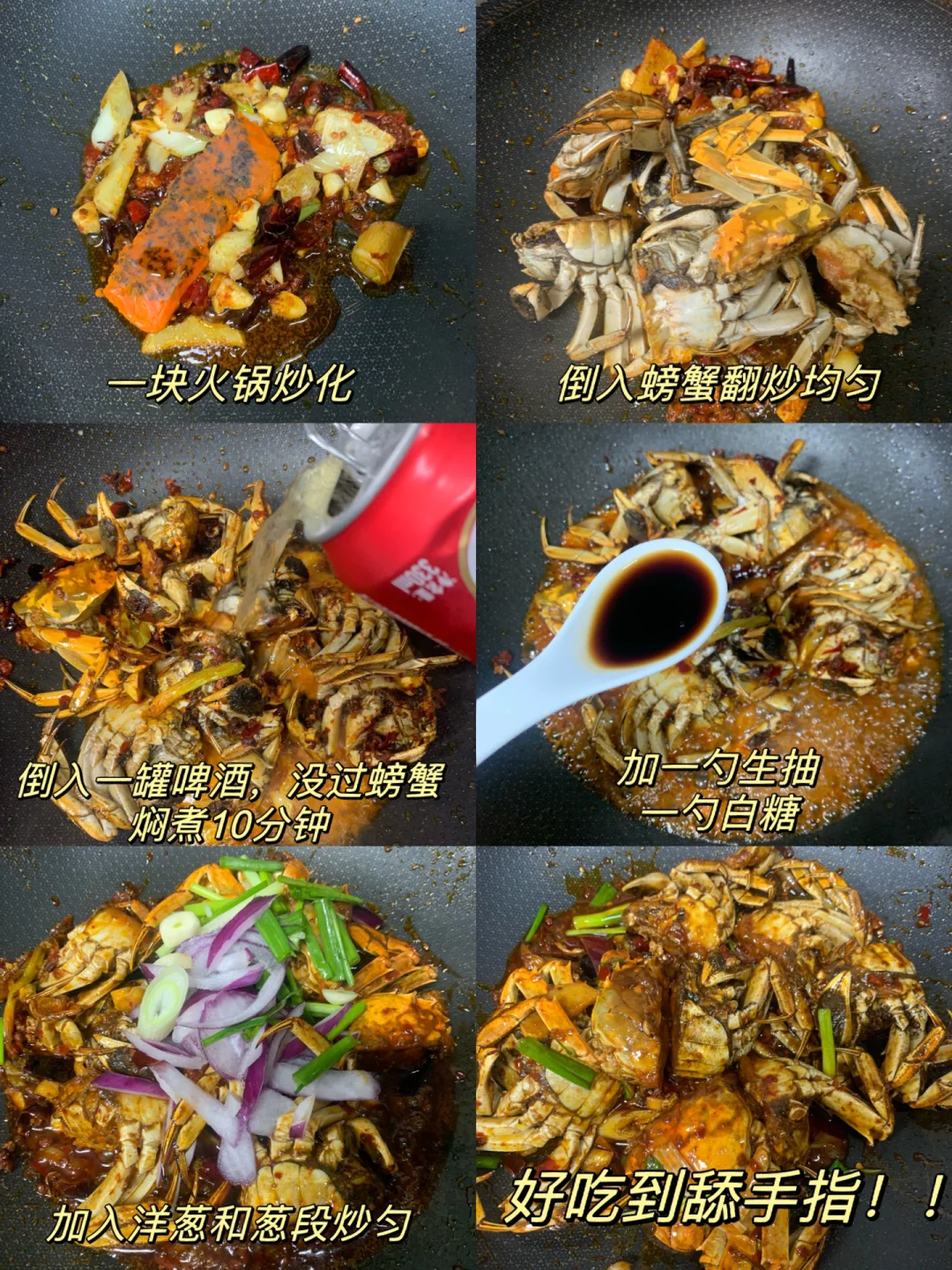 清蒸大闸蟹吃腻了试试这个香辣做法~香辣大闸蟹和外面大排档味道一模一样‼️好吃到舔手指[派对R][派对R]下酒追剧再合适不过啦~ 食材:大闸蟹、啤酒、葱段、大葱、姜、蒜、洋葱、火锅底料、干辣椒 做法: 1⃣️螃蟹处理干净对半切开,切口面沾上淀粉,抖两下去除多余的淀粉,油热放锅里煎至定型,再翻炒至变色盛出 2⃣️锅留底油,放葱姜蒜、干辣椒炒香,再放入一勺豆瓣酱炒出红油,一块火锅底料炒化,倒入螃蟹炒匀,加入一罐啤酒焖煮10分钟 3⃣️加一勺生抽,一勺白糖炒匀,再加入洋葱和葱段翻炒几下即可