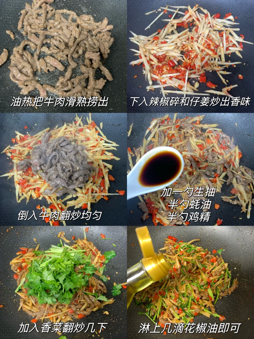 1⃣️牛肉切丝加入调料腌制15分钟,油热下锅把牛肉滑熟后捞出,小米辣和蒜捣成碎,倒入小米辣碎、蒜末和仔姜炒出辣香味,再倒入牛肉