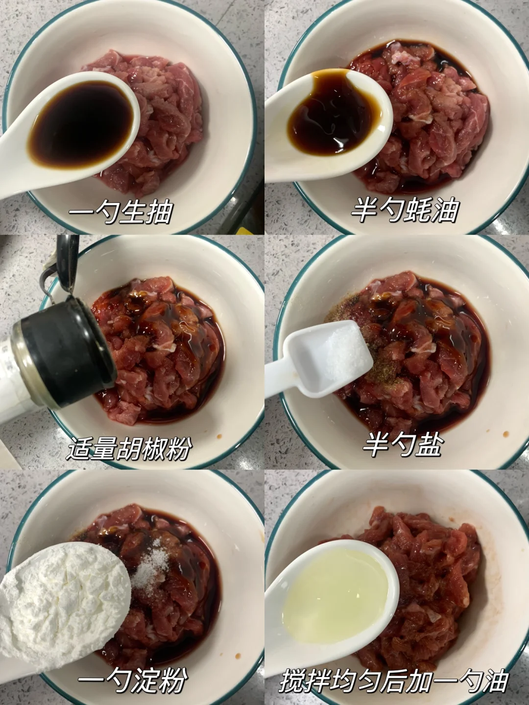 腌制牛肉:一勺生抽、半勺蚝油、适量胡椒粉、半勺盐、一勺淀粉搅拌均匀,加入一勺油腌制15分钟
