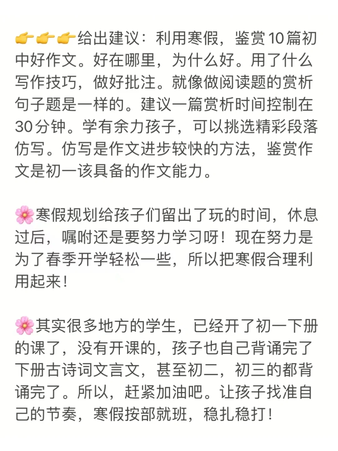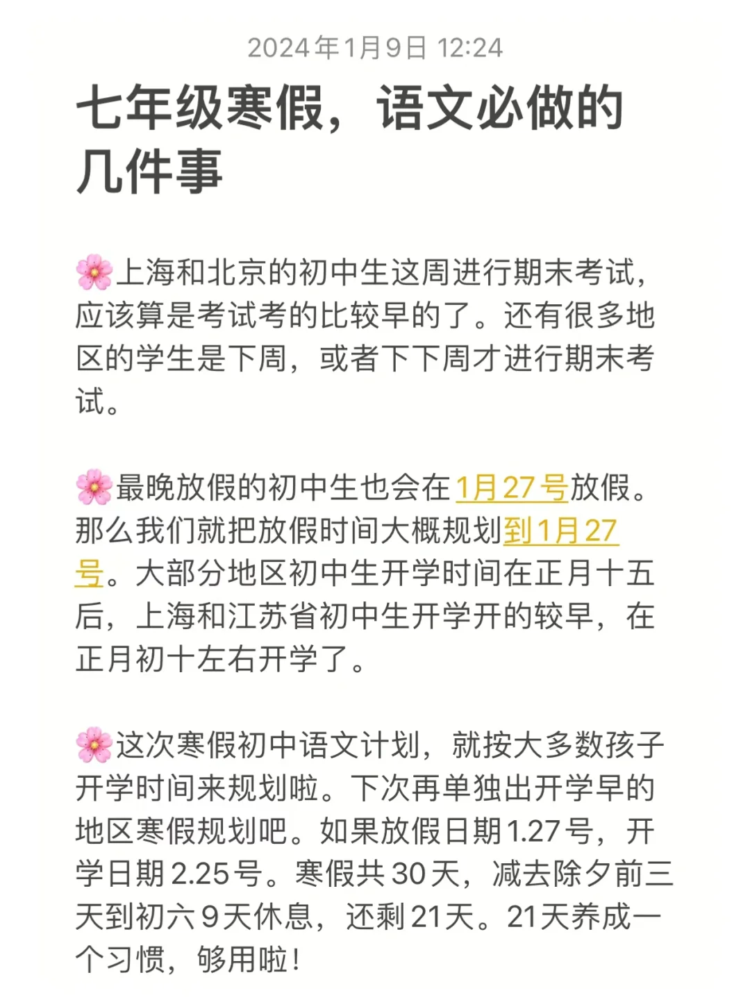 🌸这次寒假初中语文计划,就按大多数孩子开学时间来规划啦。下次再单独出开学早的地区寒假规划吧。如果放假日期1.27号,开学日期2.25号。寒假共30天,减去除夕前三天到初六9天休息,还剩21天。21天养成一个习惯,够用啦!