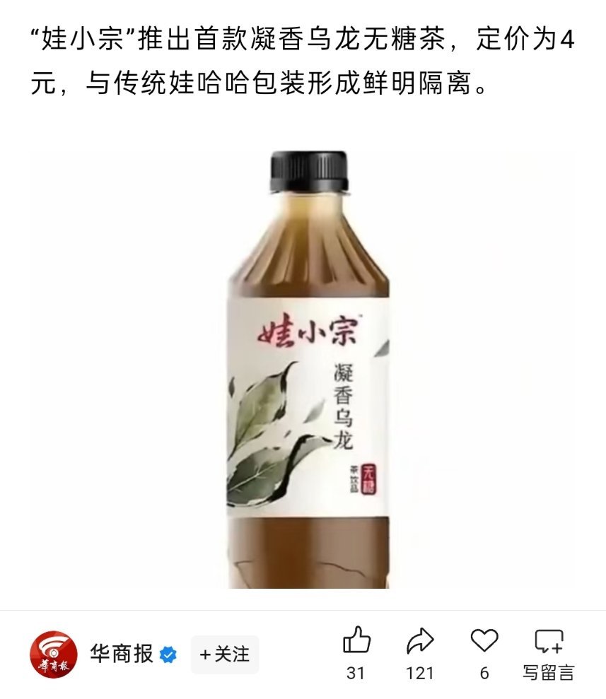 尘埃落定?娃小宗终于注册官方账号了。据媒体报道,娃小宗的首款新品是凝香乌龙无糖茶