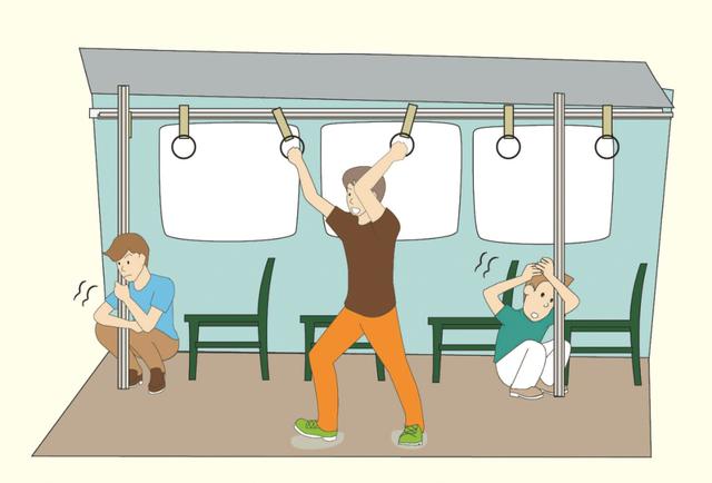(3)高楼的避震和撤离:平时选好柱子多、开间小的地方作为临时避震场所。从高楼撤离时应走安全通道,不要去乘电梯;如果震时在电梯里,应尽快离开;若打不开要蹲下,抓牢扶手。