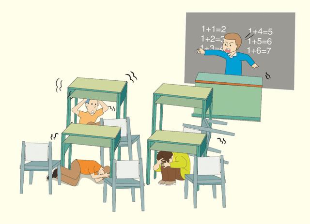 正在学校上课时,要在教师指挥下迅速抱头,躲在各自的课桌下。或有组织地迅速撤离教室,到安全的地方。