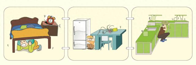 (1)室内较安全的避震地点:坚固的桌下或床边;低矮、坚固的家具边;开间小、有支撑物的房间,如卫生间、厨房、储藏室等。