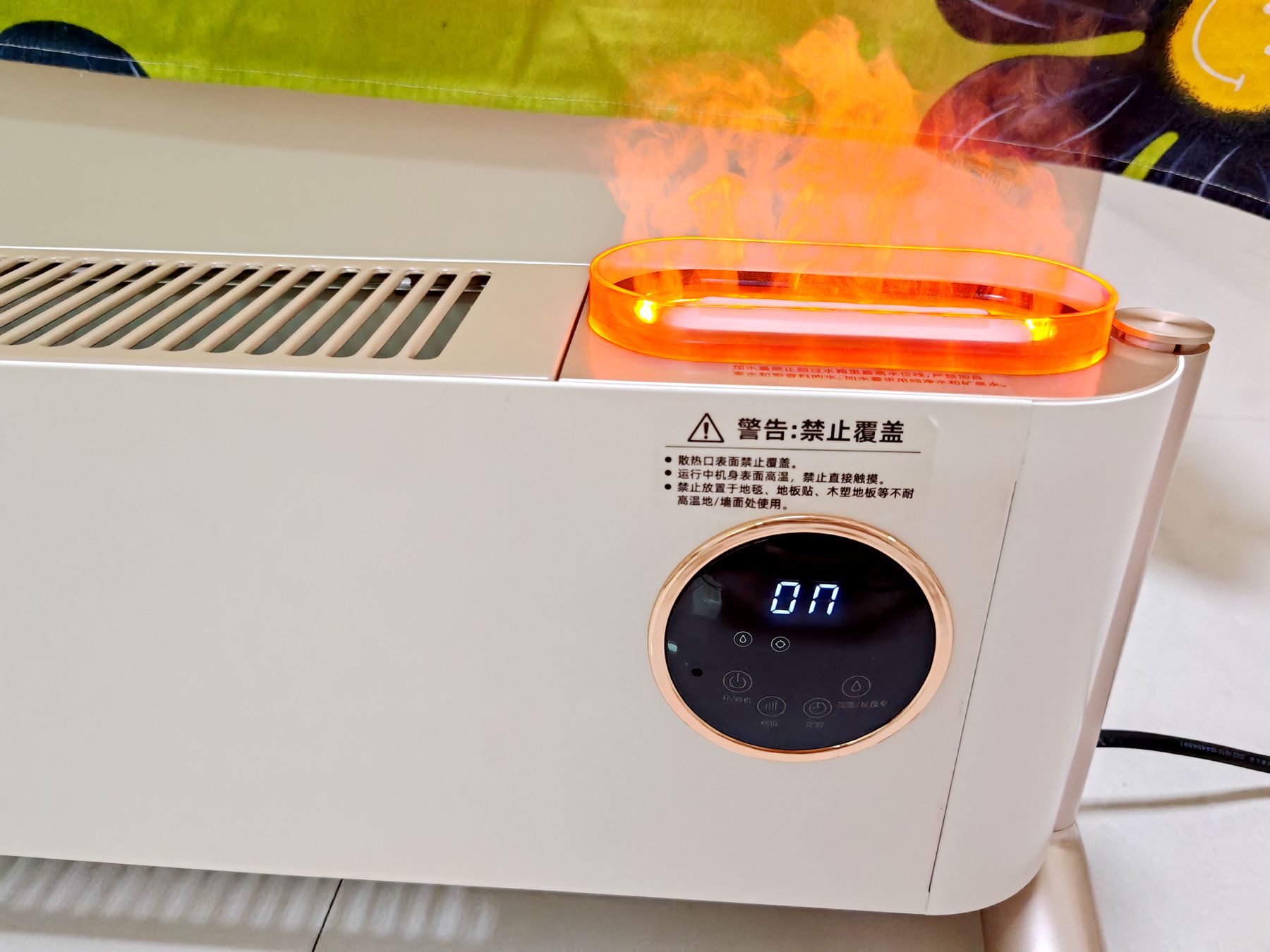 除了核心的取暖功能,这款取暖器还搭载了多项实用附加功能,大幅提升了使用体验。机身右侧内置加湿器水槽,开启取暖功能的同时可同步开启加湿模式,通过水雾补充空气湿度,避免长时间取暖导致的皮肤干燥、呼吸道不适等问题,尤其适合干燥的北方冬季和空调房使用。加湿功能还搭配了氛围灯效,水雾溢出时呈现出类似火炉的观感,为居家环境增添了几分温馨感,氛围灯可单独开启或关闭,满足不同场景需求。
