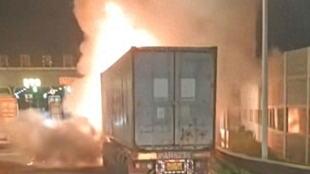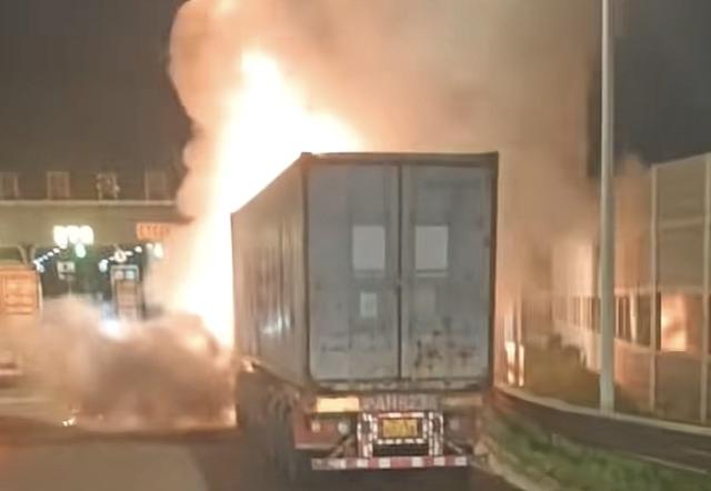 昨天(11日)晚上7时40分,G1503郊环隧道凌海路收费站出口内广场一辆集卡的车头突然起火燃烧。火情发生后,相关单位到场处置,所幸事故未造成人员伤亡。