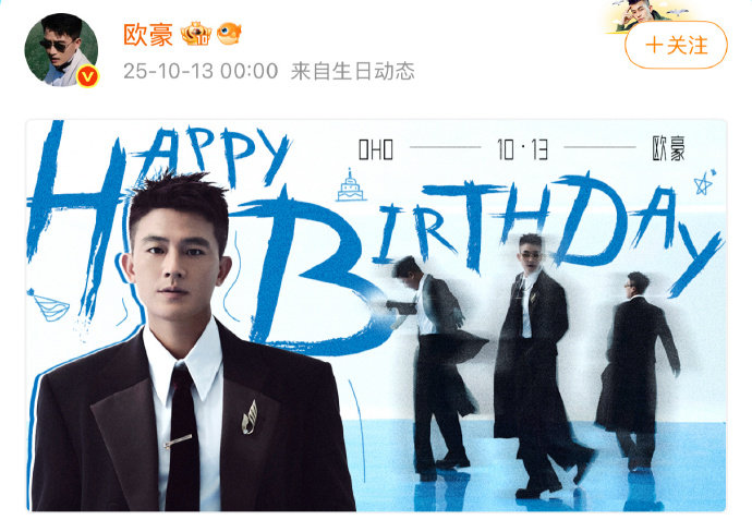 欧豪生日照来啦,是西装大衣白衬衫,满分帅气slay感得欧豪上线,生日快乐呀,期待住新一岁和你的多多见面啦!