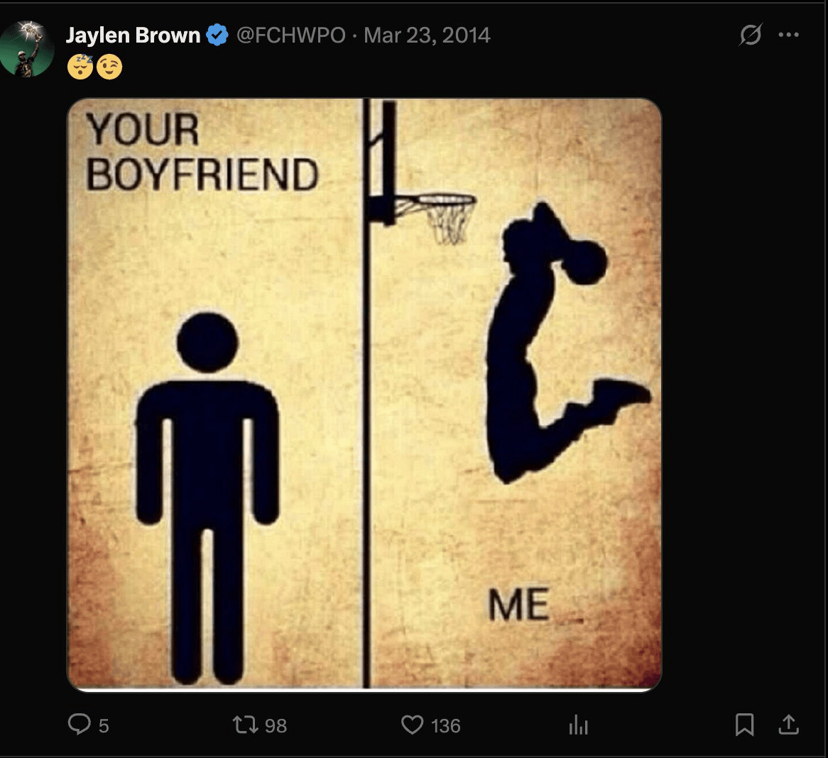 同时晒出杰伦-布朗2014年的一条推文,意指“别人的男朋友是普通人,而我可以双手暴扣”。
