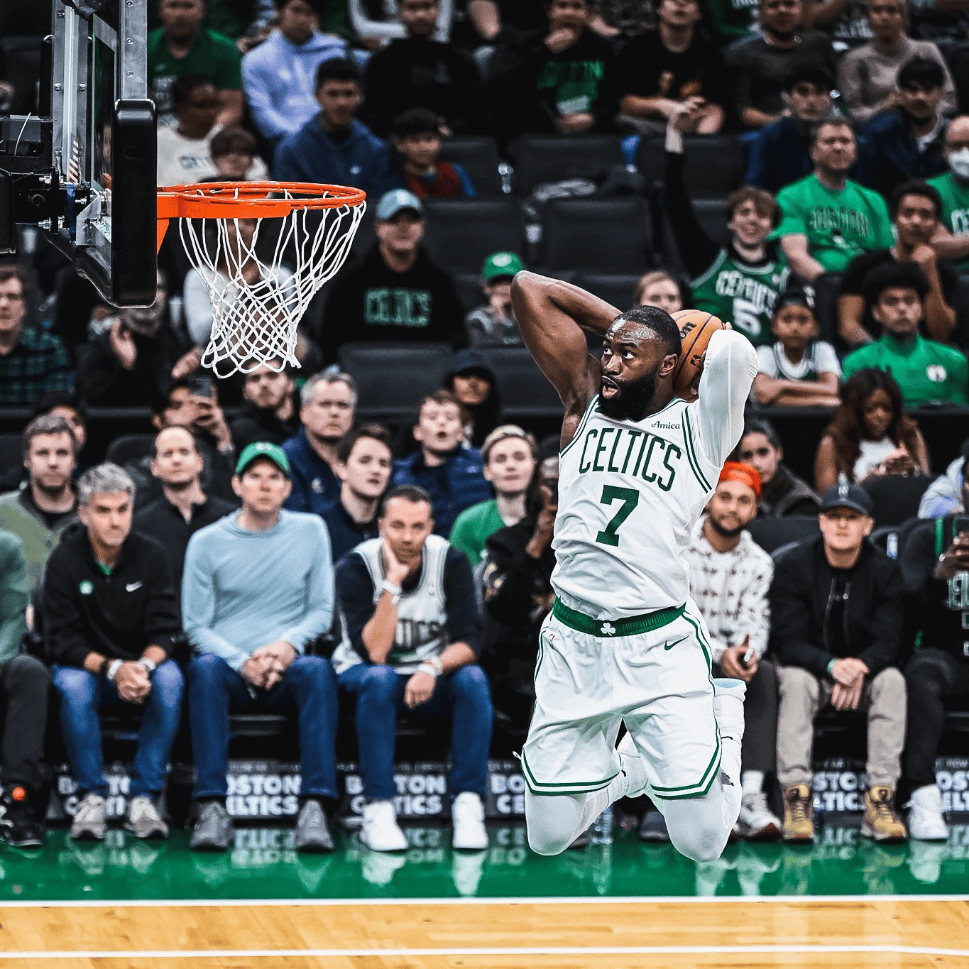 凯尔特人官方晒出杰伦-布朗本场扣篮照:杰伦-布朗和你的男朋友大不一样。