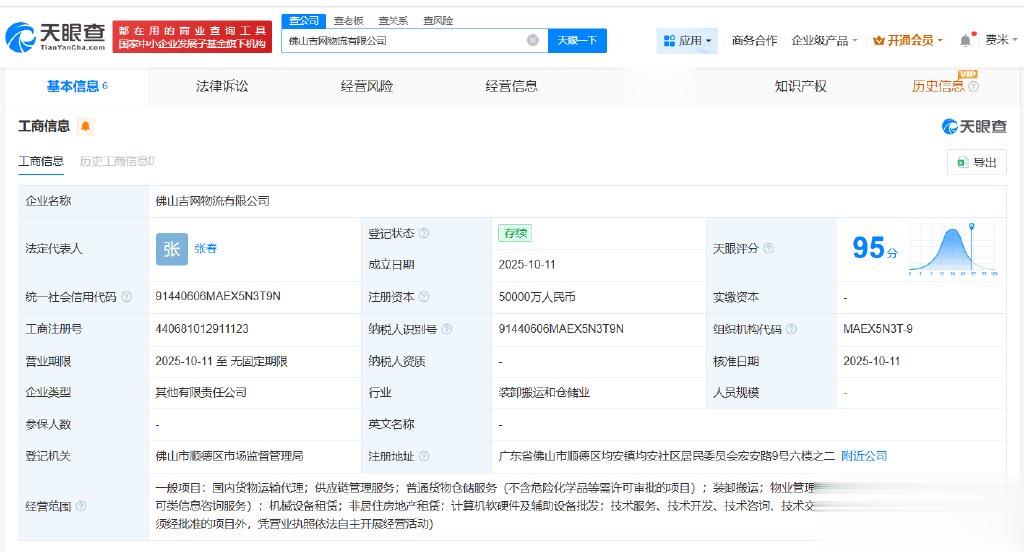 天眼查App显示,近日,佛山吉网物流有限公司成立,法定代表人为张春,注册资本5亿人民币,经营范围包括国内货物运输代理、供应链管理服务、普通货物仓储服务等。股东信息显示,该公司由中通快递股份有限公司、上海中誉通物流有限公司共同持股。