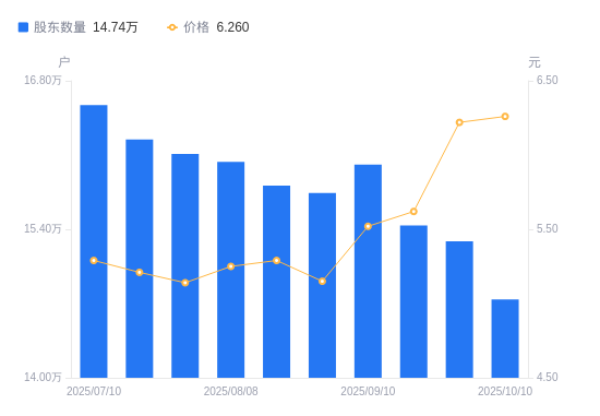 日期A股户数(户)流通A股户均持股数(股)户均持股市值(万元)2025-10-1014737922678.9814.202025-09-3015286321865.3613.602025-09-1915434821654.9912.172025-09-1016010320876.5911.522025-08-2915742521231.7310.932025-08-2015811121139.6111.182025-08-0816036420842.6110.942025-07-3116110620746.6210.662025-07-1816246720572.8210.722025-07-1016572120168.8710.67
