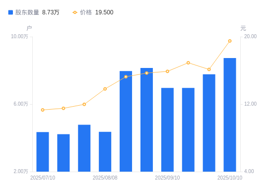 近一年(2024年10月10日至2025年10月10日),新疆交建A股股东户数从5.03万户,增加至8.73万户,增幅73.46%,区间股价上涨85.36%。