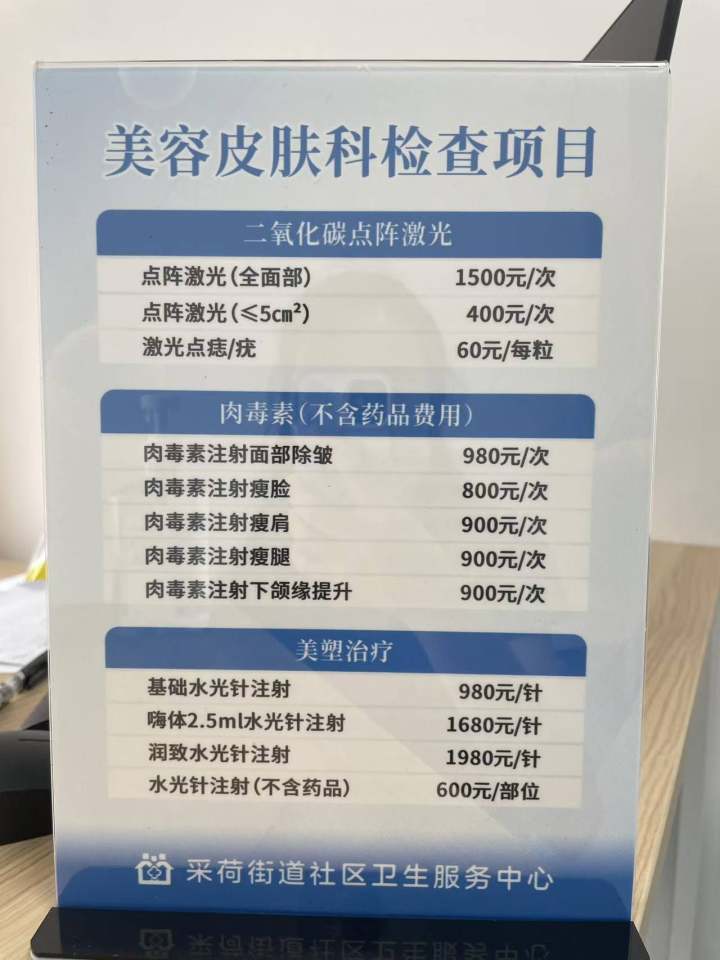 周欢欢告诉我们,皮肤美容类项目不进医保,目前的定价基本是按照单次收费,如基础水光针注射微980元/针、嗨体2.5ml水光针注射1680元/针、激光点痣60元/粒、点阵激光(全脸)1500元/次、肉毒素注射面部除皱980元/次、肉毒素注射瘦脸800元/次等。