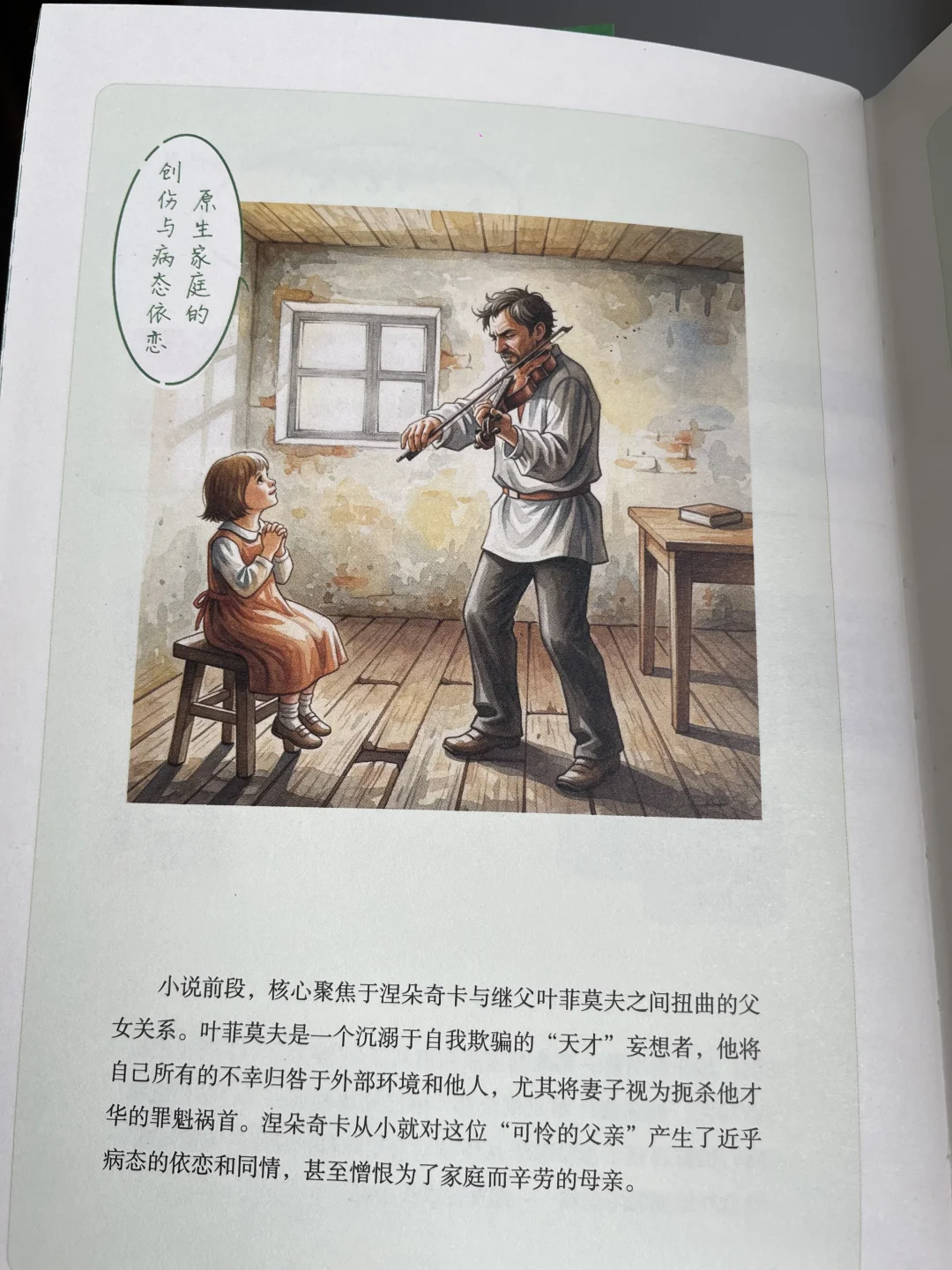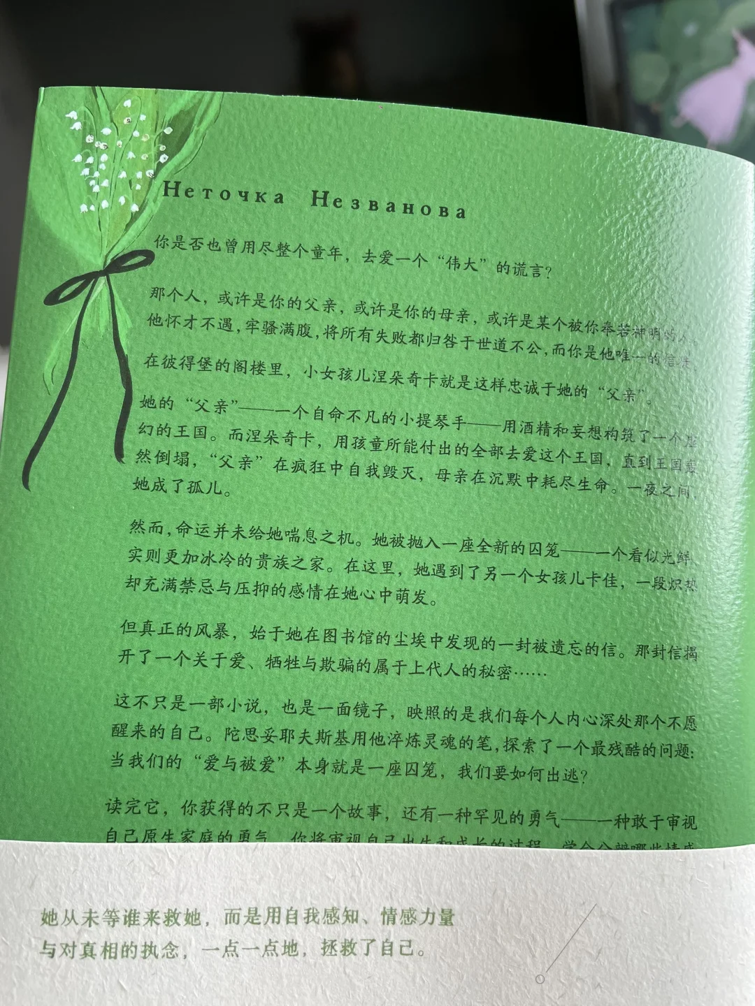 📗书名:《涅朵奇卡》 ✏️作者:陀思妥耶夫斯基 🍀 她从未等谁来救她,而是用自我感知、情感力量与对真相的执念,一点一点地,拯救了自己 · —— ✨ 这是一个关于“失控”与“重建”的故事: 这本书讲述了一个名叫涅朵奇卡的女孩,近乎残酷的成长史诗: 👺童年噩梦:她与母亲和酗酒颓废的继父生活在彼得堡的贫寒角落里,继父是个活在音乐幻想里的失败者,他的疯狂与偏执,是笼罩涅朵奇卡童年的第一重阴影。她在这个扭曲、缺爱的环境里,早熟地学会了察言观色,内心却孕育着对艺术和美好极致的渴望 · 🍀命运转折:继父死后,她被送往莫斯科的贵族公爵家。在这里,她遇见了生命中的光——公爵的女儿卡佳。两个女孩之间产生了一段炽热、纯粹甚至有些病态依恋的友情。这段关系重塑了她,也几乎毁灭了她 · 💥成年挣扎:随着与卡佳被迫分离,成年后的涅朵奇卡又陷入了另一段充满控制欲的感情。她仿佛总是在重复某种寻找依靠又失去自我的模式。整个故事,就是看她如何在这些命运的巨浪中,一次次沉浮,又一次次挣扎着把头探出水面,呼吸,活下去 — · “我想要活下去,不顾一切地活下去” 这不正是每个在困境中挣扎的女孩的内心独白吗? — · 💫 三重奏般的成长,写尽女性的困顿与觉醒 陀思妥耶夫斯基剖开了涅朵奇卡每一个成长阶段的内心,从在幻想与现实间挣扎的童年,到用全部身心去爱去依恋的少女时期,再到在爱情与自我间艰难抉择的成年期,每一段都惊心动魄,因为太真实了 · 🌟 ‌🍃愚蠢会比贫穷更强有力地压向你‌ 🍃人可以在苦难中变得更高尚,而不是被它摧毁 ‌🍃你不过是用自己的绝望毁掉自己;你既没有耐心,也没有勇气 🍃 爱总是流向不缺爱的人,就如同穷光蛋给亿万富翁捐款 — · 这不只是一本小说,更像是一面镜子,照见每个女性在成长中那些不为人知的挣扎、依赖与最终的坚韧,如果你也曾在关系中感到迷失,如果你也需要一份推倒重建的勇气 请一定看看这本书,它会让你知道,即使在最深的绝望里 ,依然可能重生