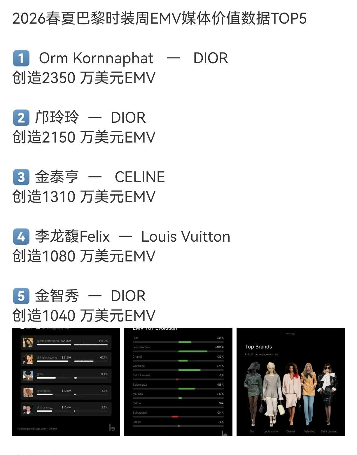 本次时装周EMV影响力数据柳智敏 朴成训 金智秀均上榜 where is 张元