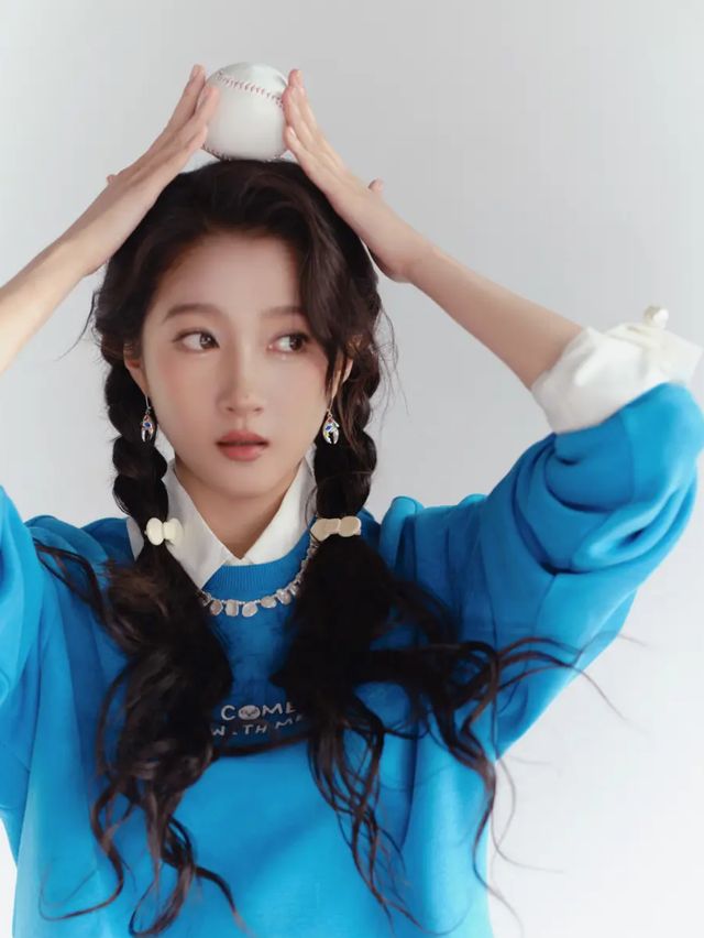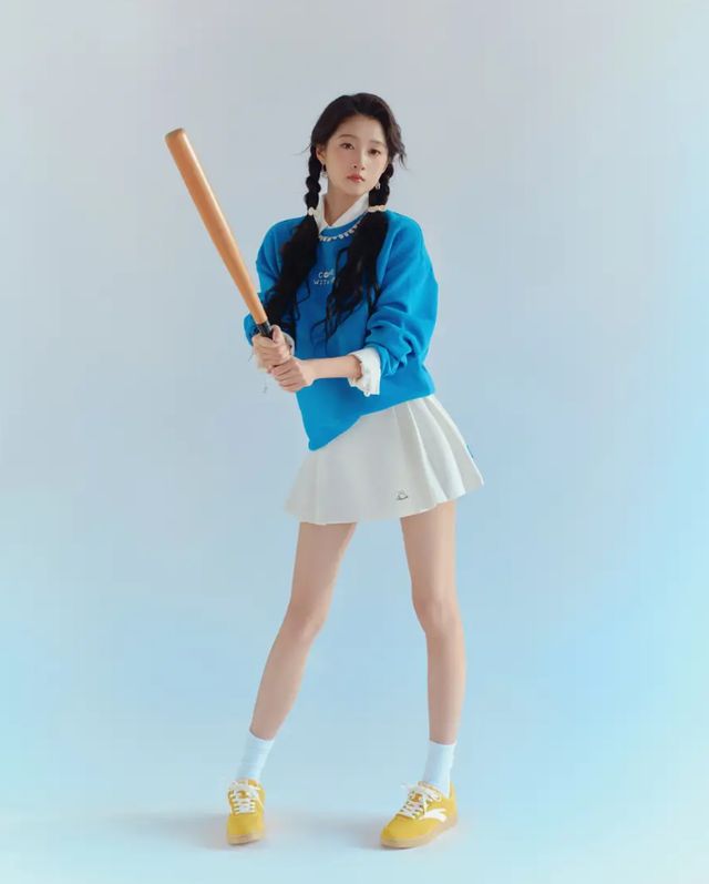 身穿蓝色卫衣和白色短裙的关晓彤,在写真照片中化身成为了一个棒球少女,手里拿着棒球棒和棒球,动作看起来十分标准。