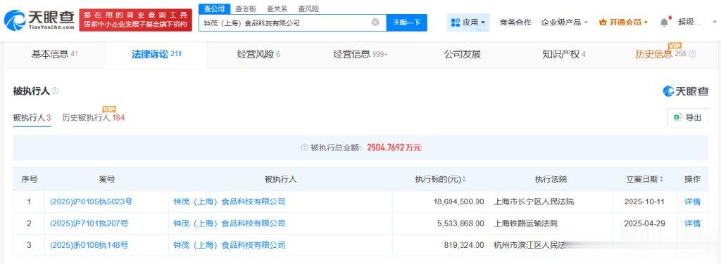 天眼查天眼风险信息显示,近日,钟茂(上海)食品科技有限公司新增1条被执行人信息,执行标的1869万余元,涉及与分众传媒有限公司相关广告合同纠纷,执行法院为上海市长宁区人民法院。