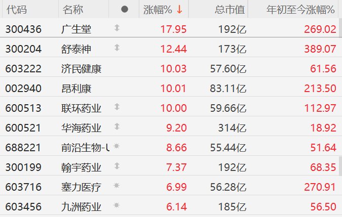 格隆汇10月15日|A股市场创新药概念股集体走强,其中,广生堂涨近18%,舒泰神涨超12%,济民健康、昂利康、联环药业10CM涨停,华海药业涨超9%,前沿生物涨超8%,翰宇药业涨超7%,塞力医疗、九洲药业涨超6%。