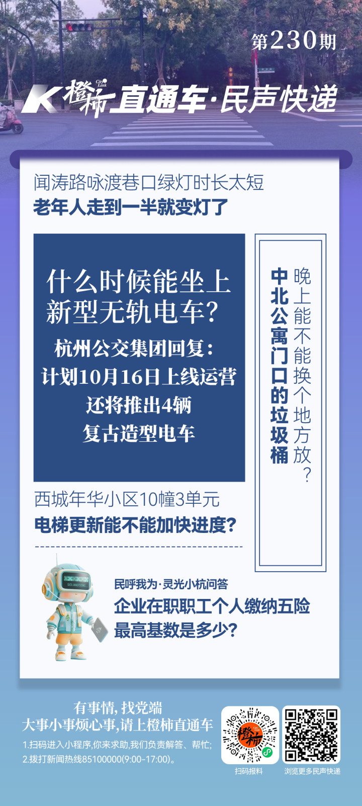 “12345”政务服务热线与“橙柿互动”联合打造的“民呼我为·灵光小杭”智能问政系统已正式上线。打开橙柿互动App,点击首页中的“灵光小杭”卡通小图(上图),即可进入“民呼我为·灵光小杭”问答页面,在对话框中输入问题,“灵光小杭”将第一时间给出权威答复。