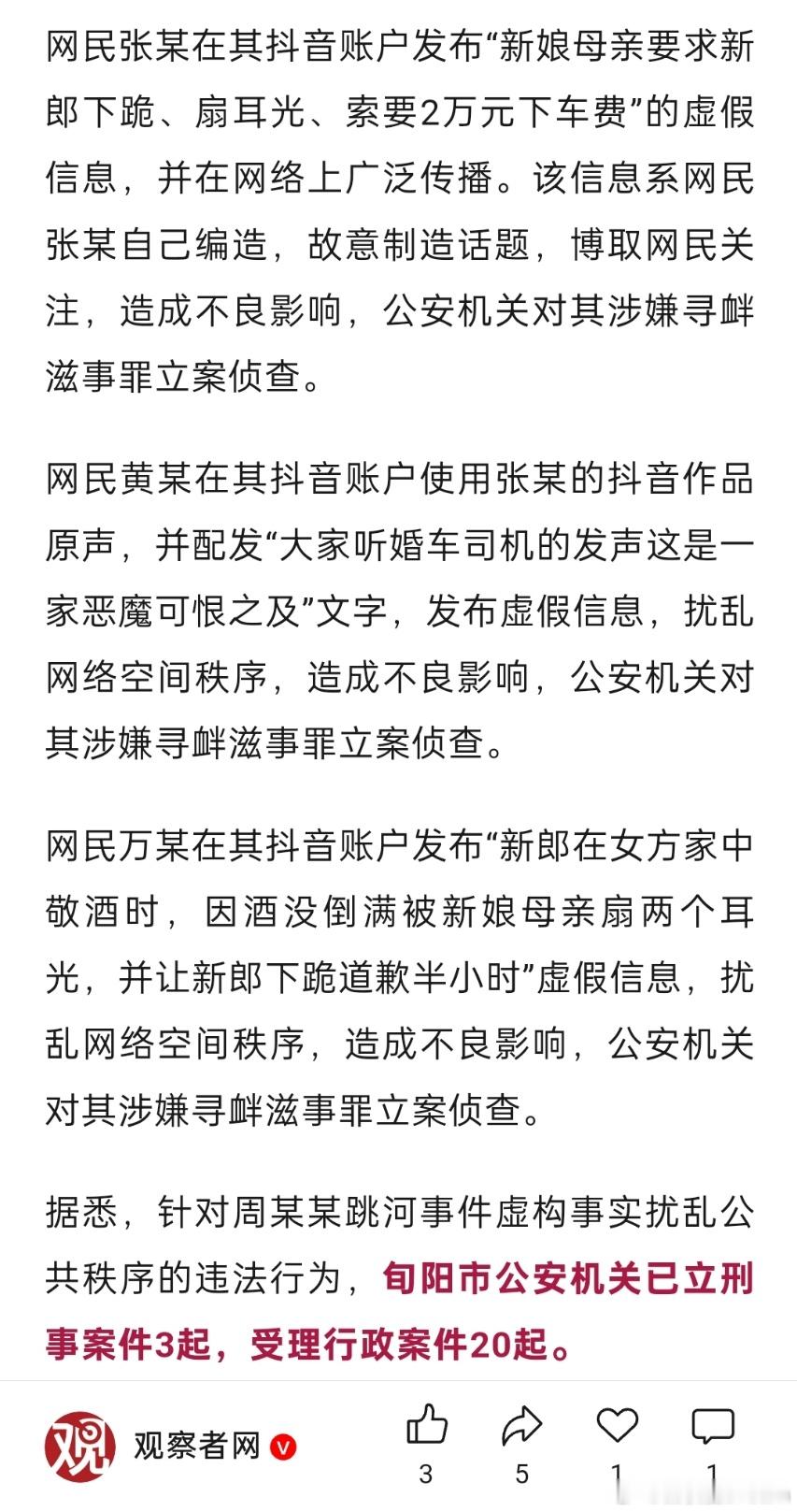 🔻3名网民造谣新郎跳河事件被立案。