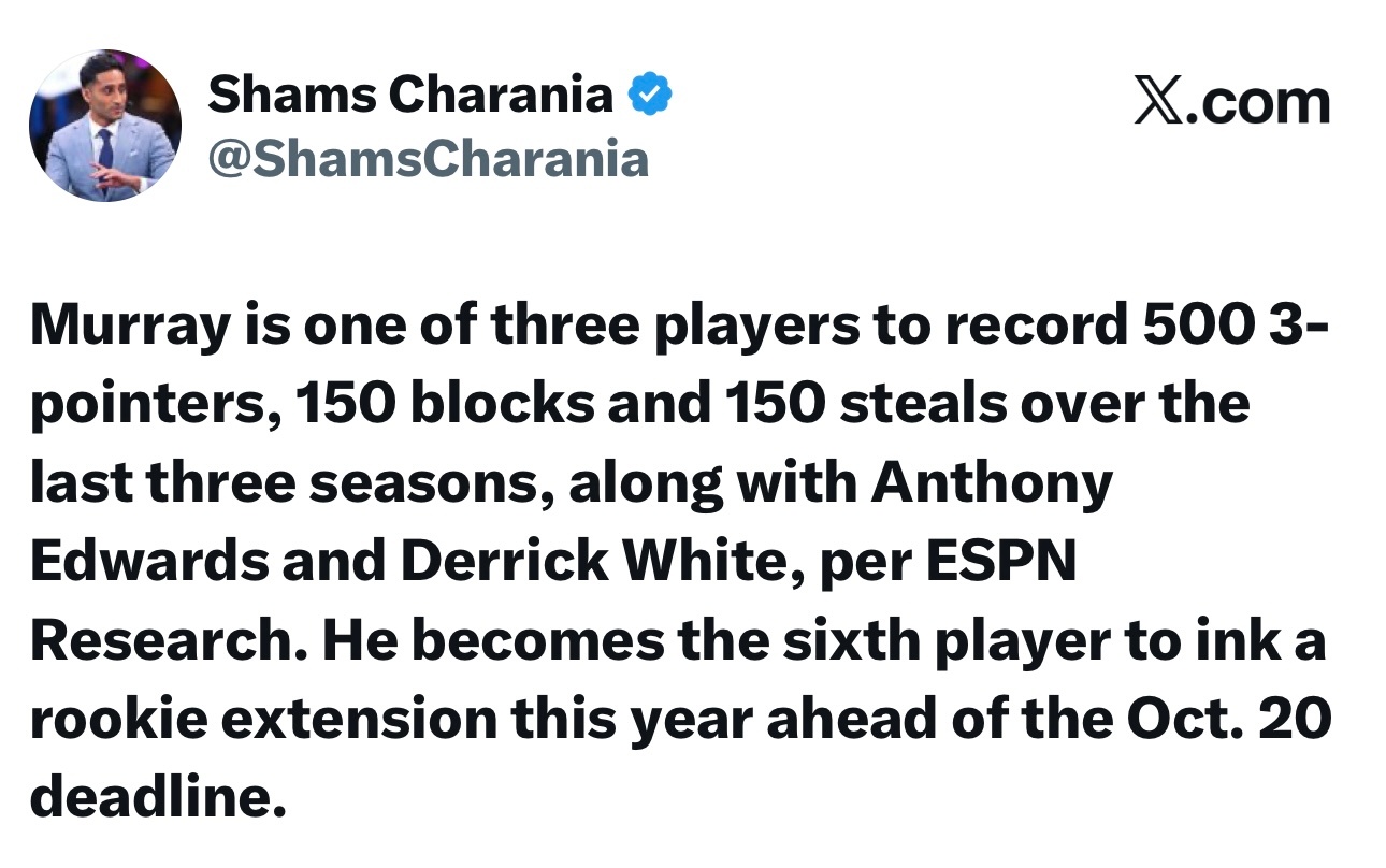 Shams:2022年4号秀,基根-穆雷与国王达成5年1.4亿提前续约合同。