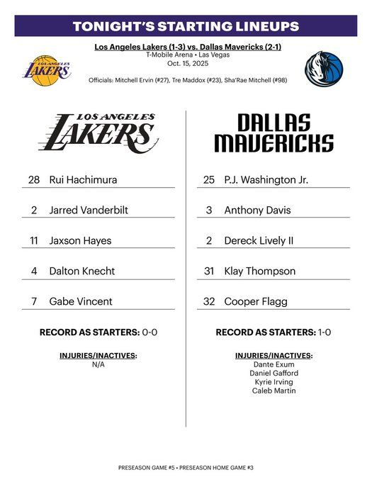 背靠背轮休昨天主力!湖人首发:文森特,克内克特,八村塁,范德比尔特,海斯独行侠首