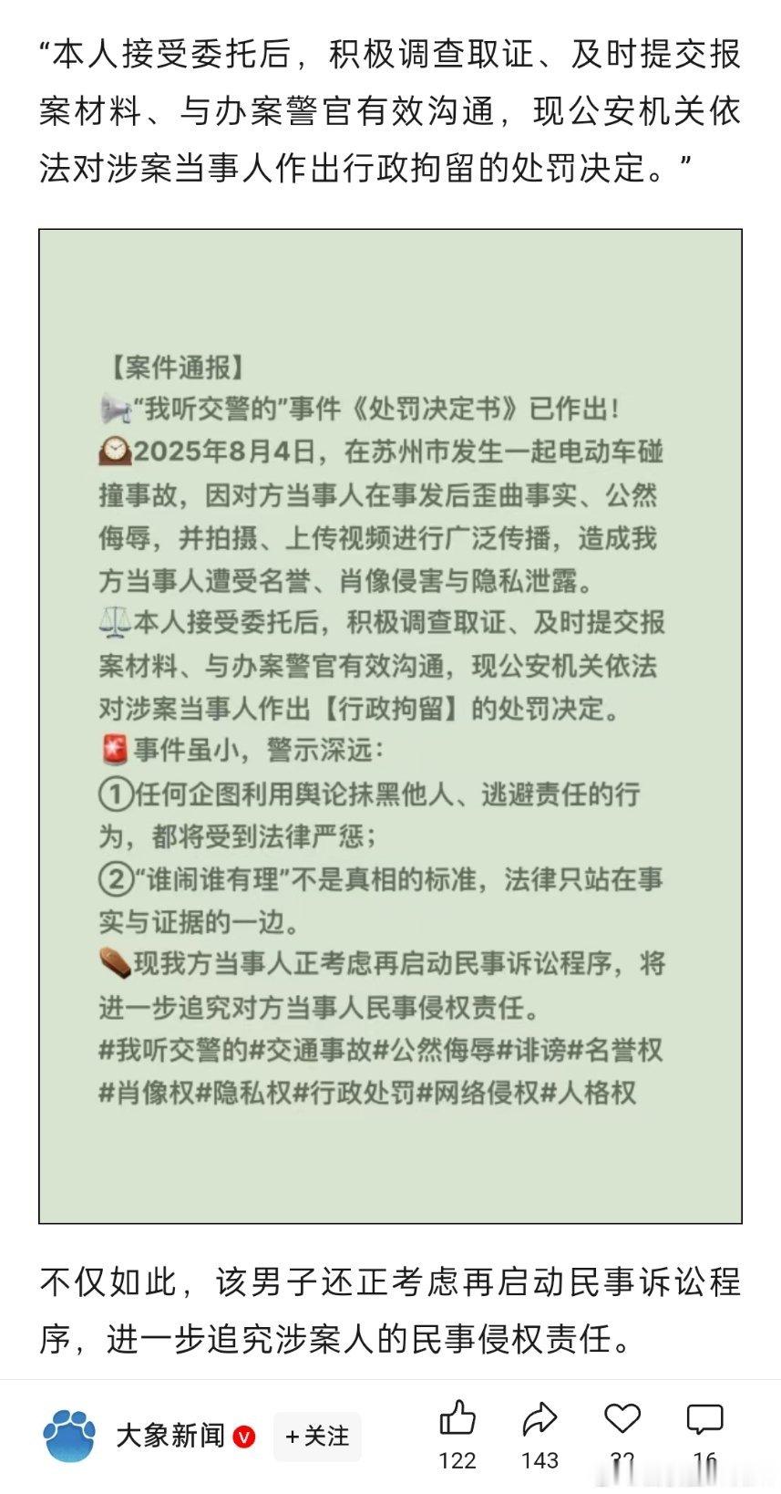 我听交警的事件后续:涉事女子被行拘!男子考虑进一步追究对方的责任。大快人心![哆