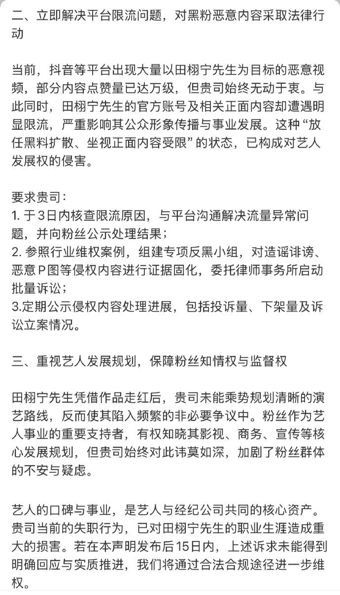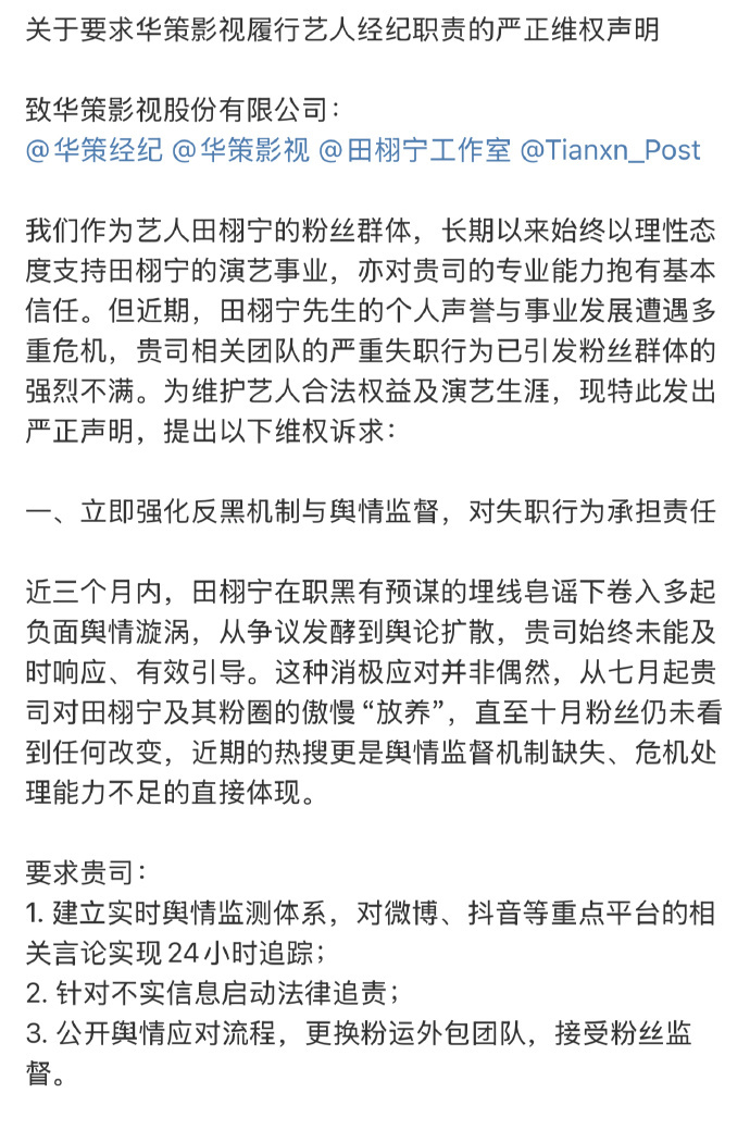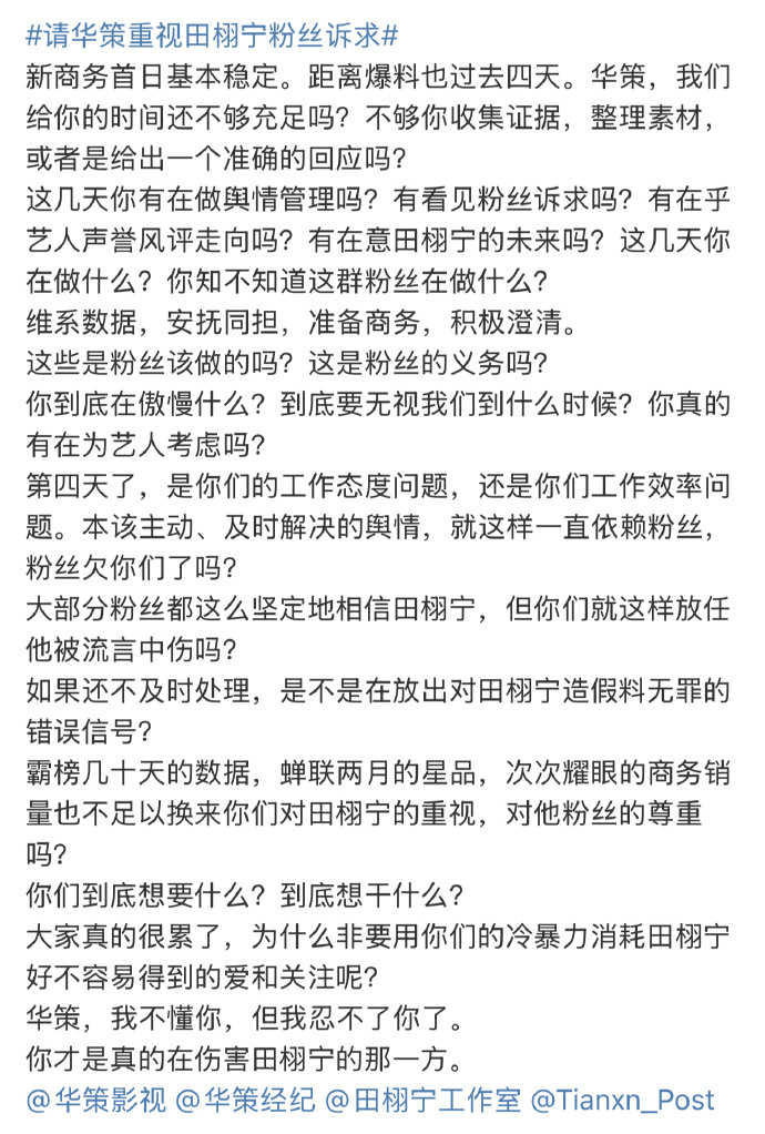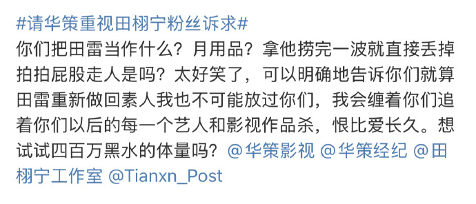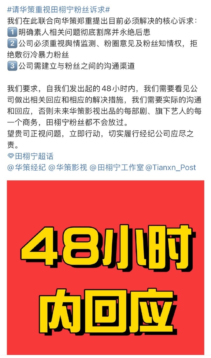田栩宁粉丝向华策维权请华策重视田栩宁粉丝诉求