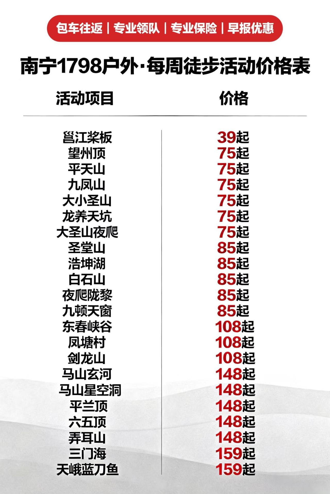 周末别躺平了!和大学生上班族一起逃离城市 【南宁徒步天花板‼️】周末别躺平了!大学生上班族一起逃离城市计划⛰️ 谁说南宁周边没有好玩的地方! 打工人周末解压 大学生课余探险 南宁1798户外带你解锁N种徒步方式🔥 ✅包车往返+专业领队+专业保险 ✅每周发团 说走就走 ✅越早报名越优惠 姐妹冲鸭! ———————————— 💥热门路线推荐: 【39元起】邕江桨板 夏日玩水首选 小白也能轻松上手 【75元起】望州顶/平天山/九凤山 入门级徒步路线 治愈系草原风光 【85元起】圣堂山/浩坤湖/白石山 喀斯特地貌绝美 拍照超出片 【108元起】凤塘村/剑龙山 挑战级路线 户外达人必打卡 【148元起】平兰顶/六五顶 “广西小新疆”云端草原美到哭 【159元起】三门海/天峨蓝刀鱼 探秘地下河 蓝到不像话的玻璃水 ———————————— 👉适合人群: 想结交新朋友的社交牛人症 想释放压力的996打工人 想探索自然的户外小白/大神 🎒装备建议: 轻便背包、运动鞋、防晒用品,头灯,登山杖 自备干粮饮用水 快乐出发! ———————————— 📍关注@南宁1798户外 每周更新徒步计划🌿 👇点击主页立即报名 带上你的搭子 周末山里见! 南宁徒步 南宁周边游 广西旅游 大学生周末 南宁上班族 户外登山 徒步丈量世界 南宁1798户外 带你趣户外