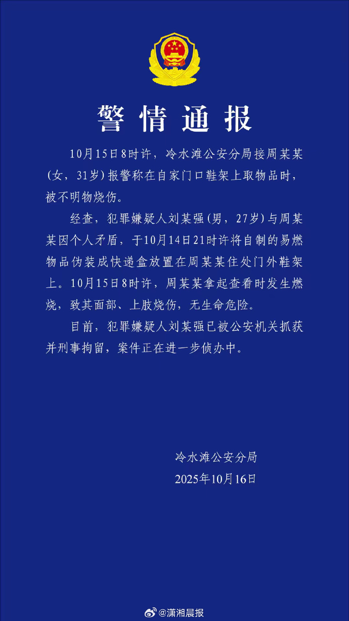 经查,犯罪嫌疑人刘某强(男,27岁)与周某某因个人矛盾,于10月14日21时许将自制的易燃物品伪装成快递盒放置在周某某住处门外鞋架上。10月15日8时许,周某某拿起查看时发生燃烧,致其面部、上肢烧伤,无生命危险。