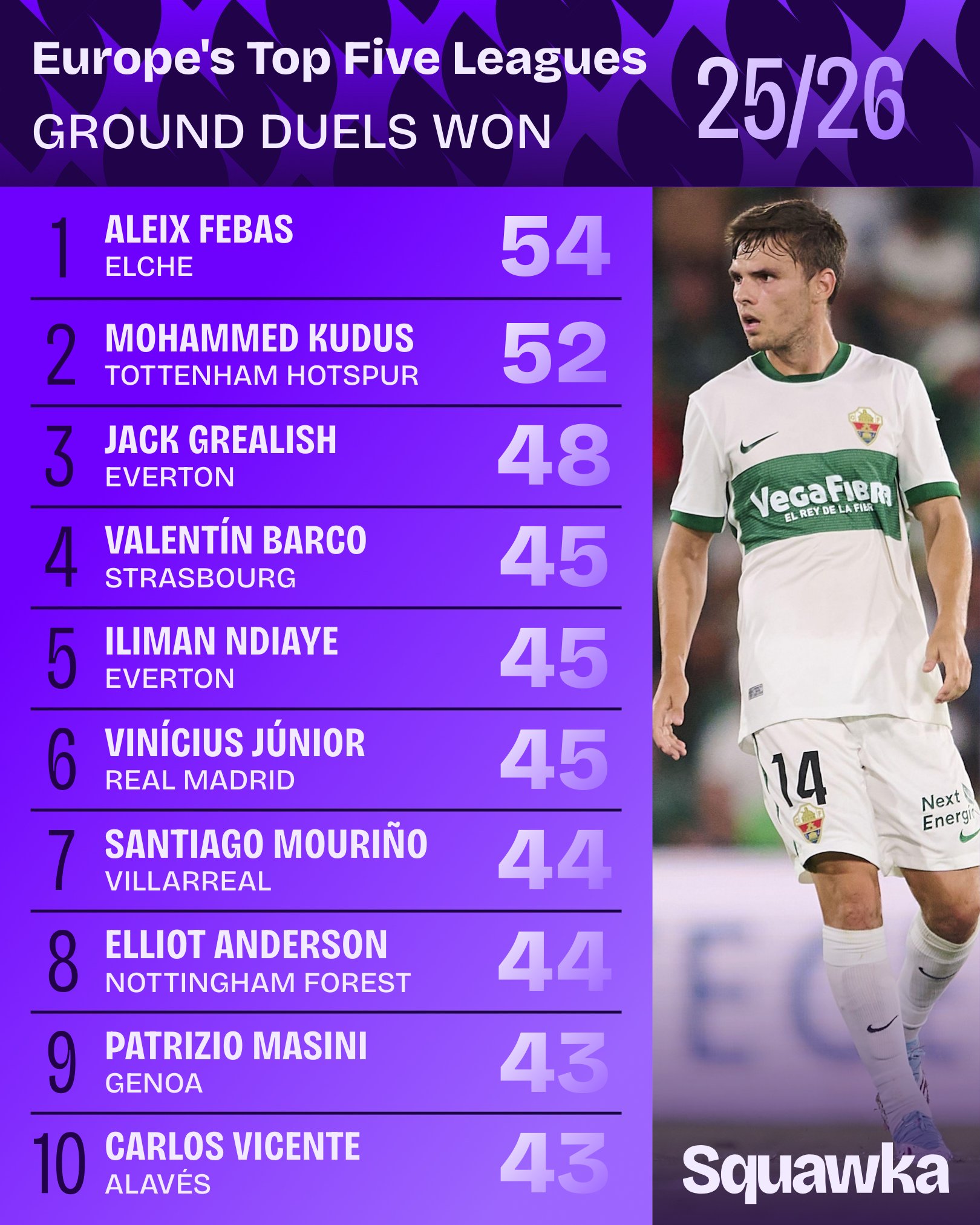 虎扑10月16日讯Squawka数据统计本赛季至今五大联赛地面对抗胜出榜,埃尔切中场费巴斯居首,库杜斯、格拉利什分列二三。