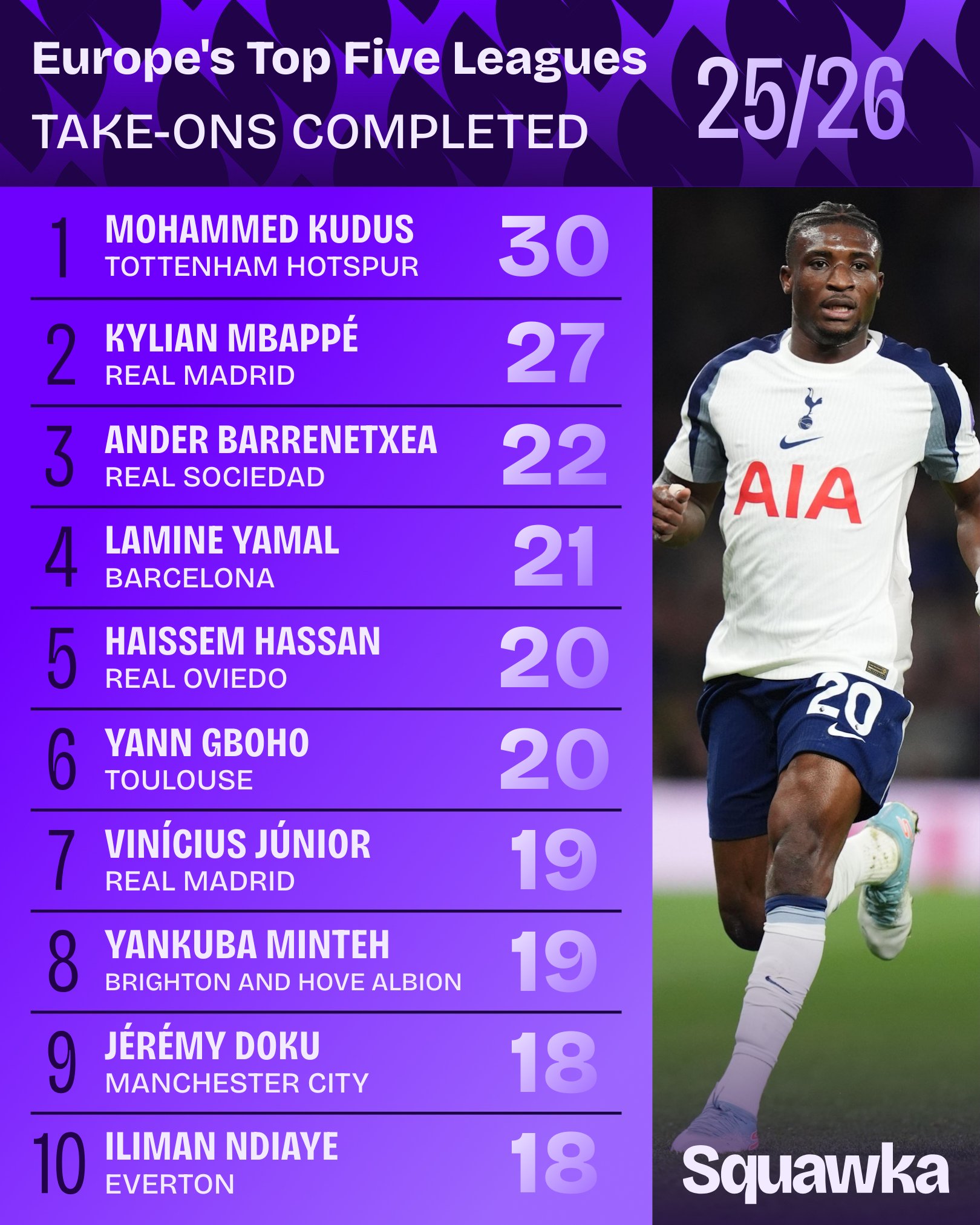 虎扑10月16日讯Squawka数据统计本赛季至今五大联赛过人榜,库杜斯30次居首,姆巴佩第二,亚马尔第四。