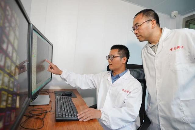 毕国强(右)与陶长路(左)讨论冷冻电镜数据采集。中国科大供图