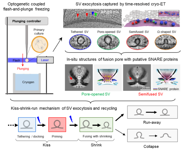 在该研究中,研究团队通过自主研发的毫秒级时间分辨原位冷冻电镜成像技术,破解了神经信息传递过程中,突触囊泡释放与快速回收的完整生物物理过程,并提出“亲吻-收缩-逃逸/融合”模型。这一成果统一了科学界关于突触囊泡释放与回收机制长达50年的两个争议模型,为理解神经信号传递、神经可塑性及相关脑疾病机理提供了全新视角。